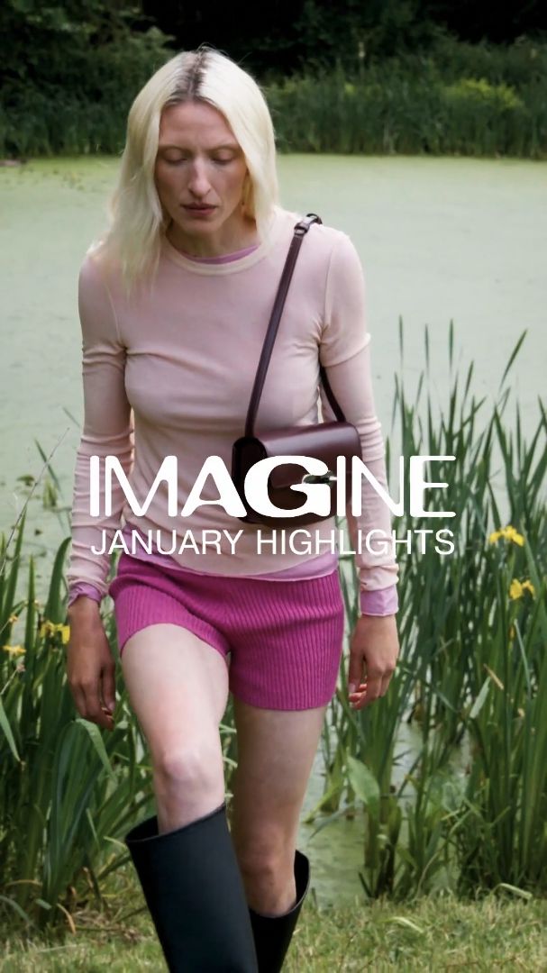 A person with long blonde hair is wearing a light pink long-sleeve top, bright pink shorts, and knee-high black boots. They are walking through a lush, green area with tall grasses, next to a pond with yellow flowers and green plants. The background is composed of dense greenery, creating a serene, natural scene.