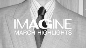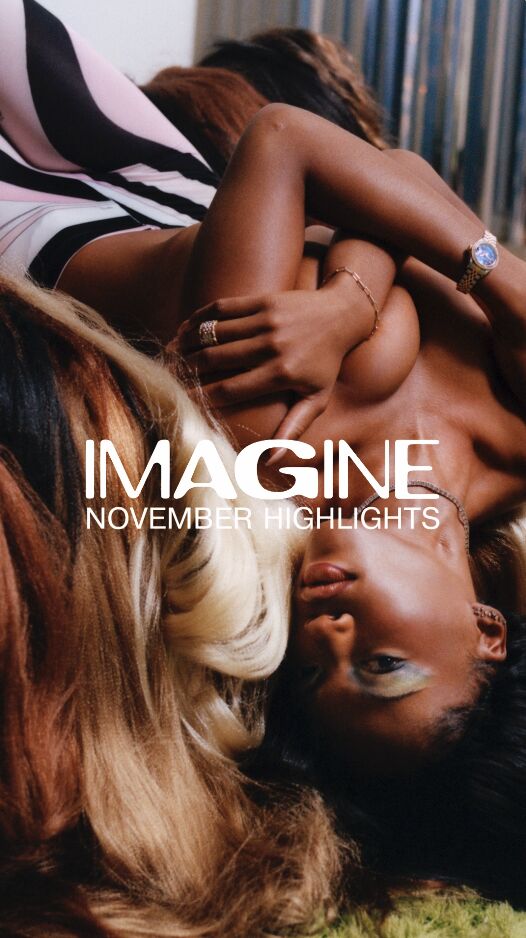 A stylish scene features a person standing on a small platform, surrounded by ornate white paneling. They wear a floral skirt with a fringe and bright red tights paired with dark red heeled shoes. A champagne flute rests on the platform, adding a touch of elegance. The setting suggests a mix of classical architecture and modern fashion.