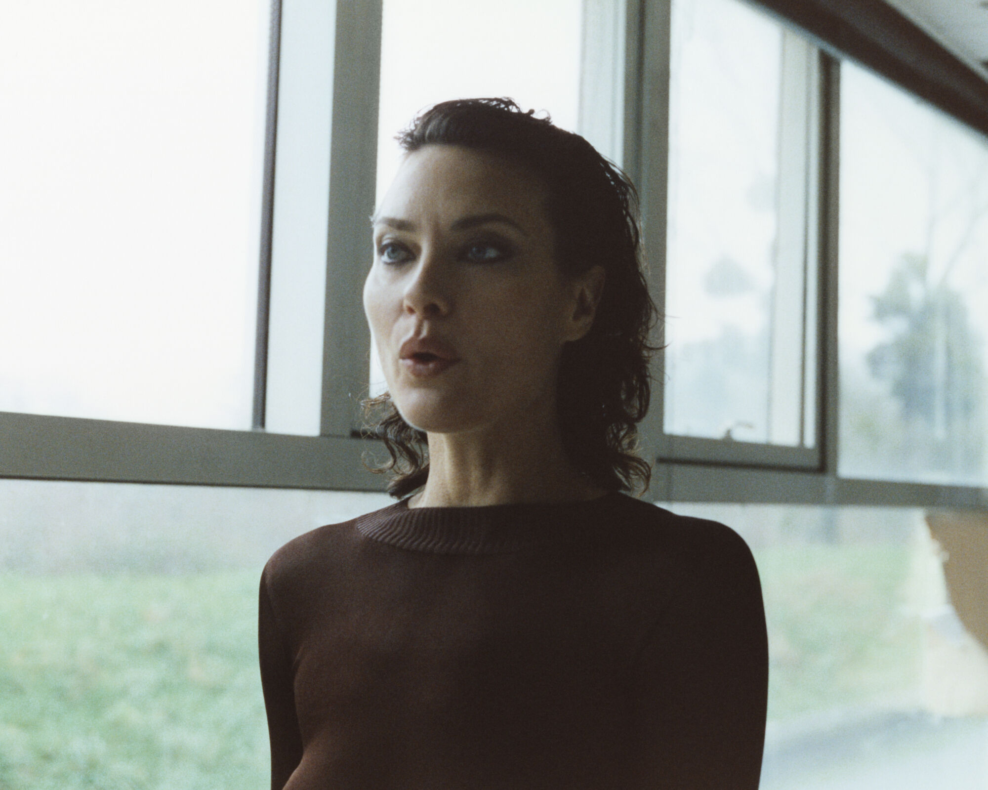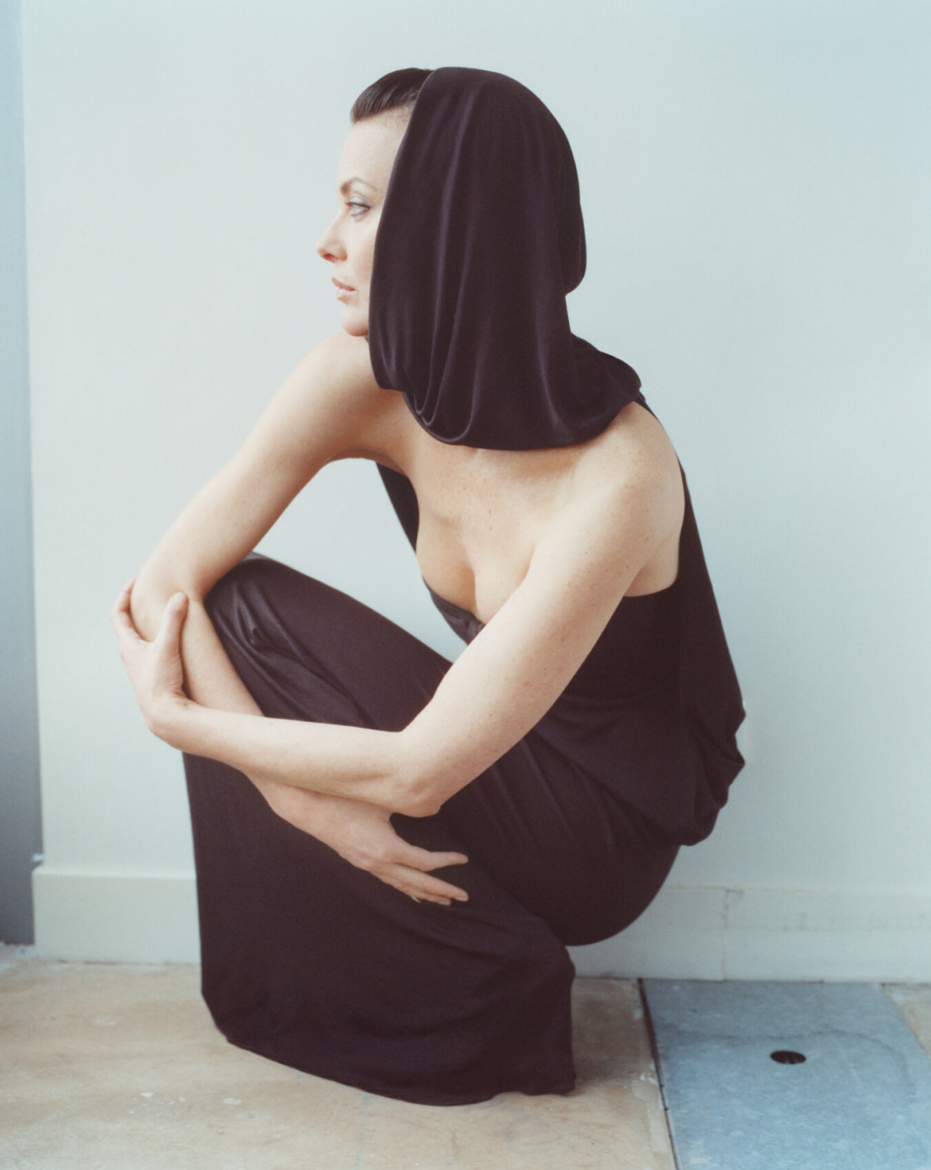 A woman dressed in a sleek, dark, draped garment strikes a contemplative pose. Her outfit elegantly wraps around her form, with the hood drawn over her head. She sits against a light-colored background, her knees drawn up, arms resting around them. The minimalist setting and her serene expression evoke a sense of calm and introspection.
