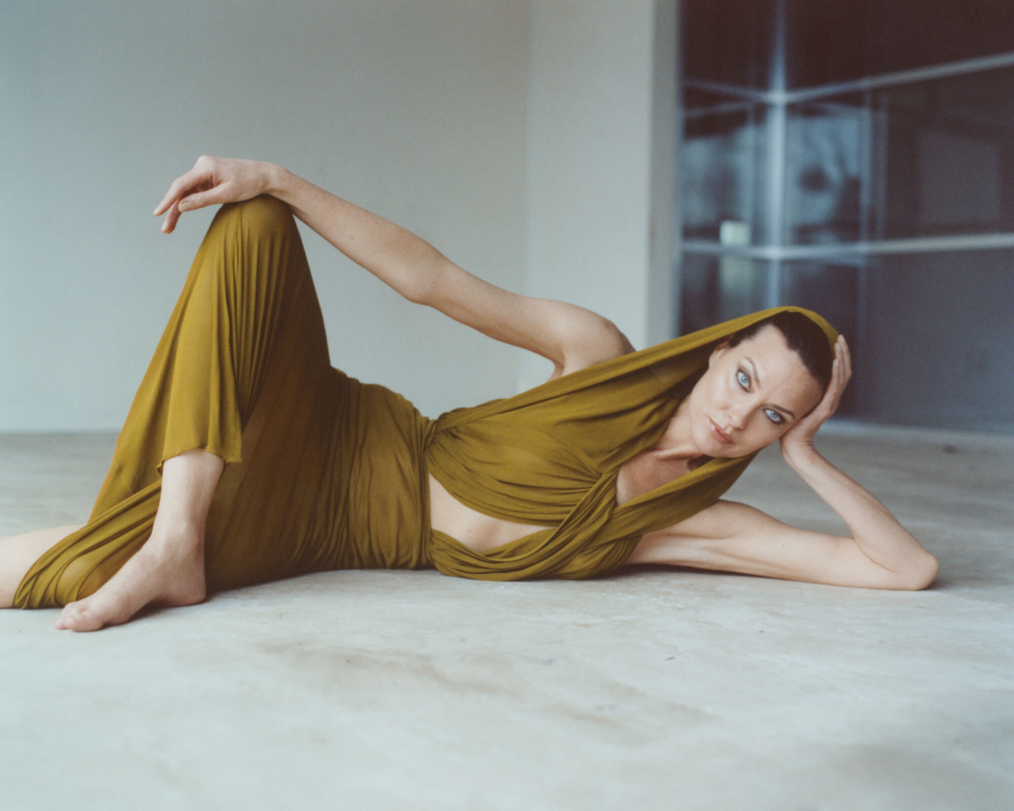 A person reclines stylishly on a light-colored floor, draped in an elegant, flowing olive-green outfit. The fabric wraps around their body, leaving one arm and midriff exposed. An open space with muted walls and minimal furnishings serves as the backdrop, creating a serene, contemporary atmosphere that highlights the person's relaxed yet poised demeanor.