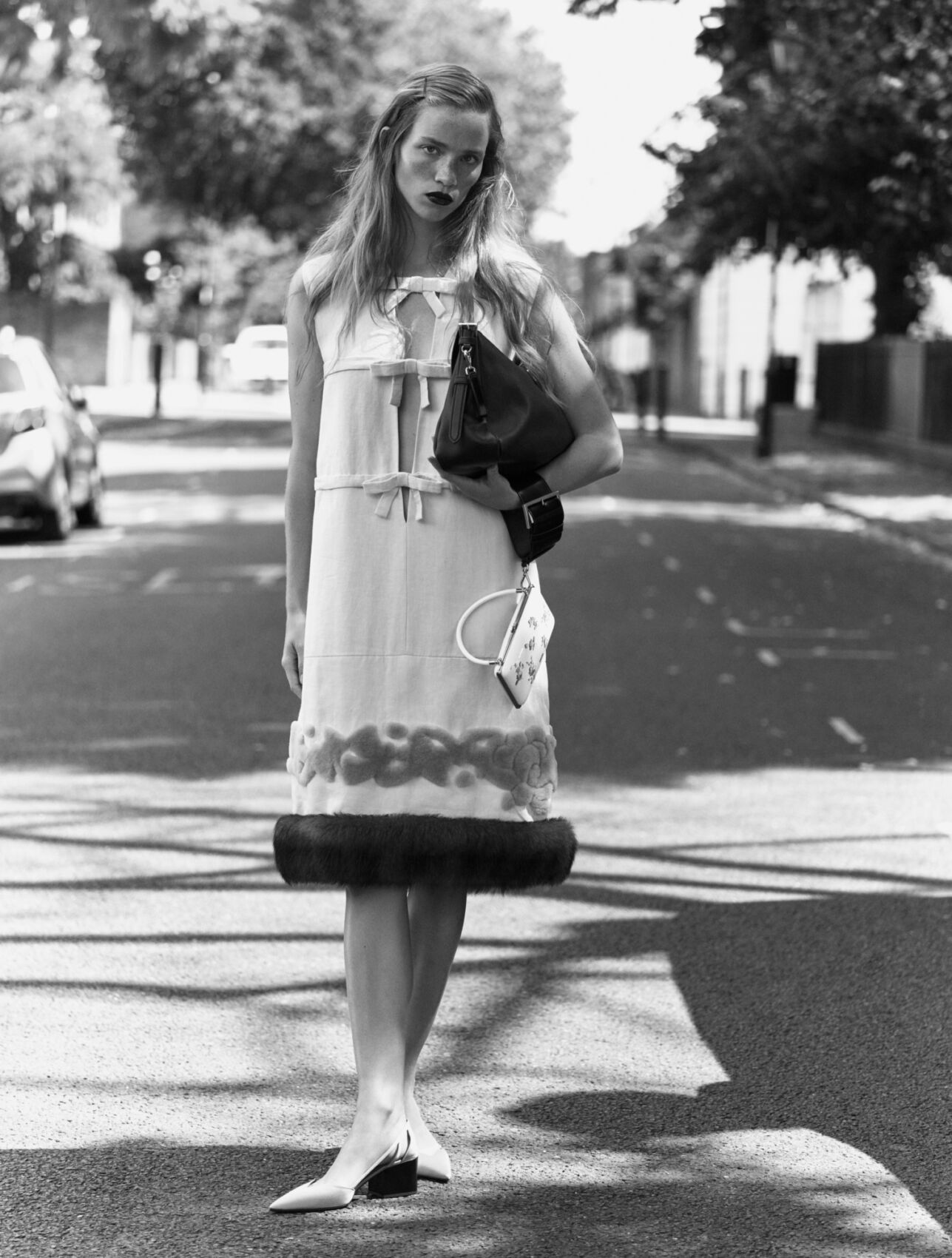 A woman stands confidently on an empty street, surrounded by blurred foliage and shadows. Her long, wavy hair frames a composed expression. She wears a stylish dress with a fur-trimmed hem and holds a chic handbag. The setting exudes a serene yet slightly dramatic atmosphere, enhanced by the interplay of light and shadow on the pavement.