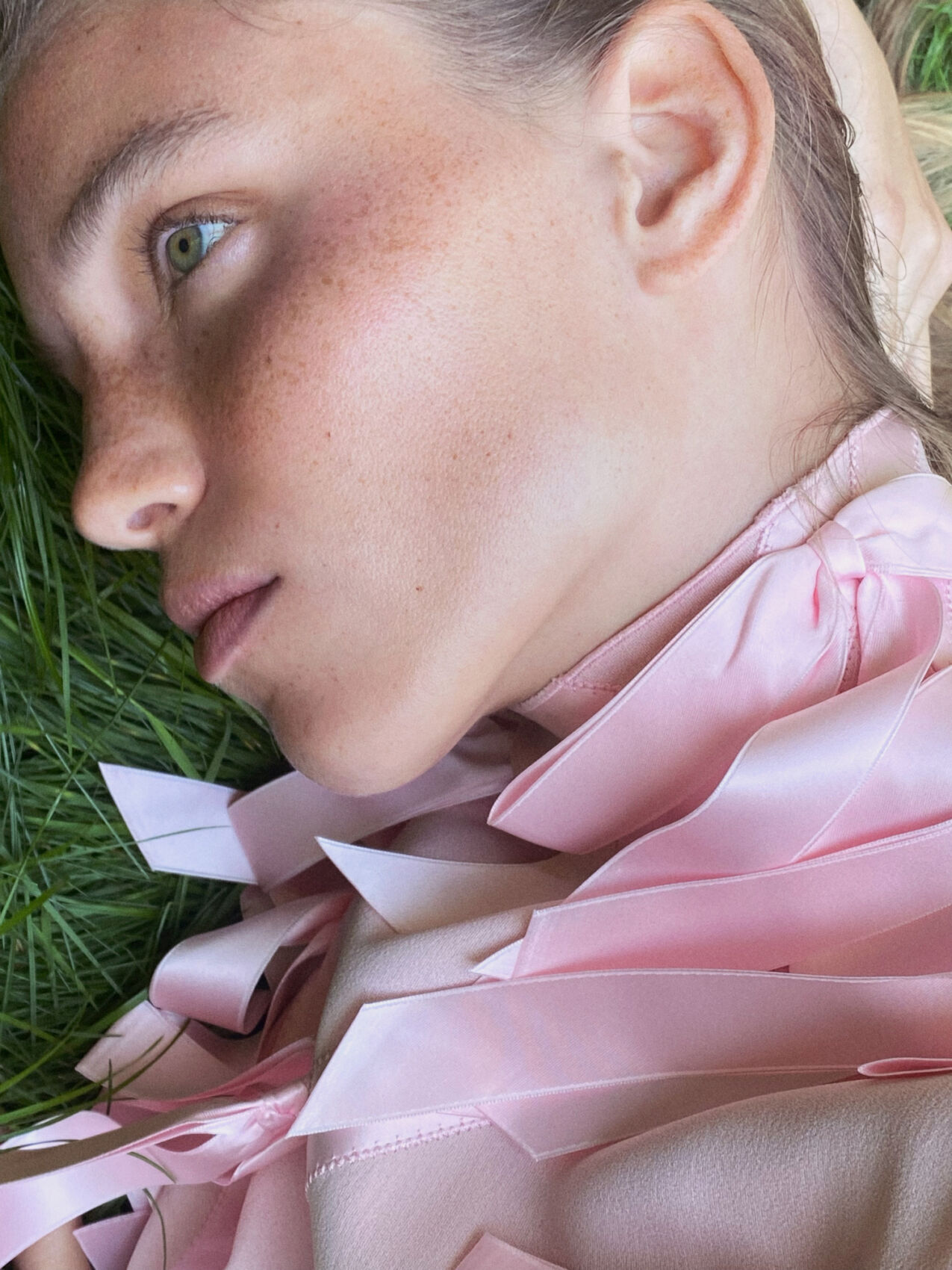 A close-up view captures a serene face with soft features, highlighted by natural light. Freckles are visible on the cheek, and the eye gazes thoughtfully. The individual wears a delicate, pale pink material adorned with layered ribbons. The backdrop consists of lush green grass, providing a tranquil and harmonious setting, emphasizing a peaceful, restful moment.