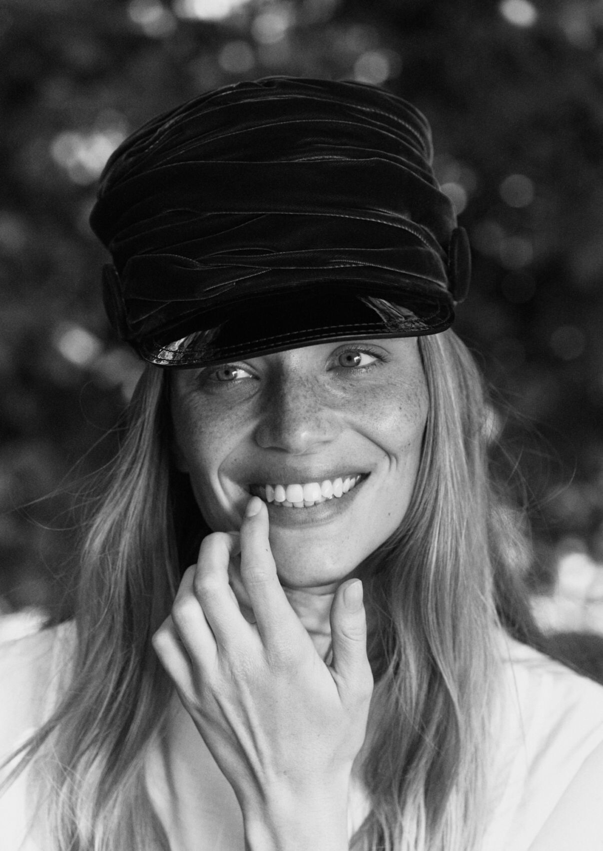 A person with long hair and freckles wears a dark textured cap, partially covering the forehead. They exhibit a bright, genuine smile, revealing straight teeth, and their gaze is directed forward. One hand gently touches their chin. The background is softly blurred, adding a serene and intimate atmosphere, while the lighting accentuates facial features and texture.