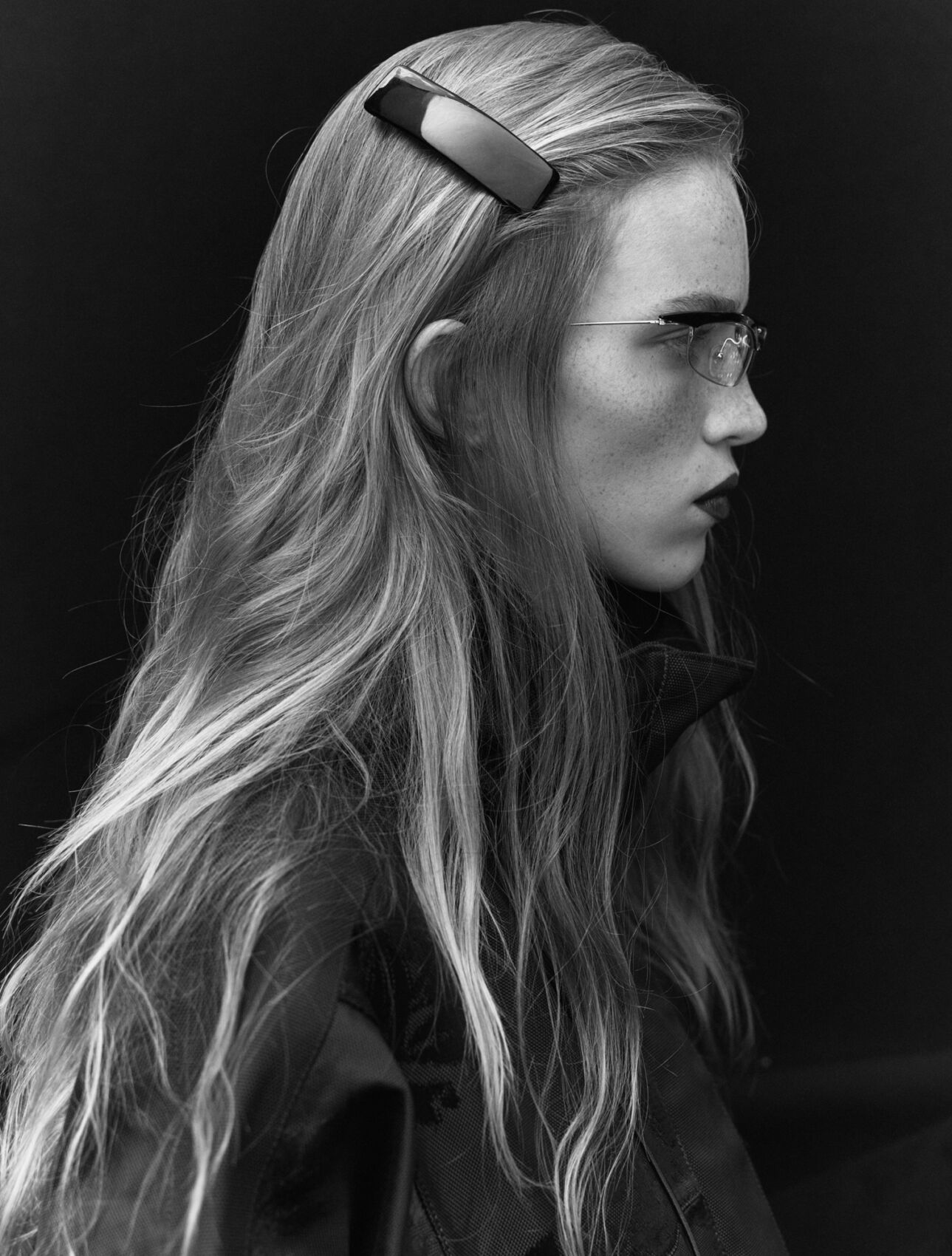 A black and white side profile of a person with long, wavy hair, slightly parted to the side. A dark hair clip is securing the hair neatly. The individual is wearing rectangular glasses and a high-collared garment, exuding a poised and contemplative expression. The monochrome tones accentuate the hair's texture and the subtle freckles on the face.