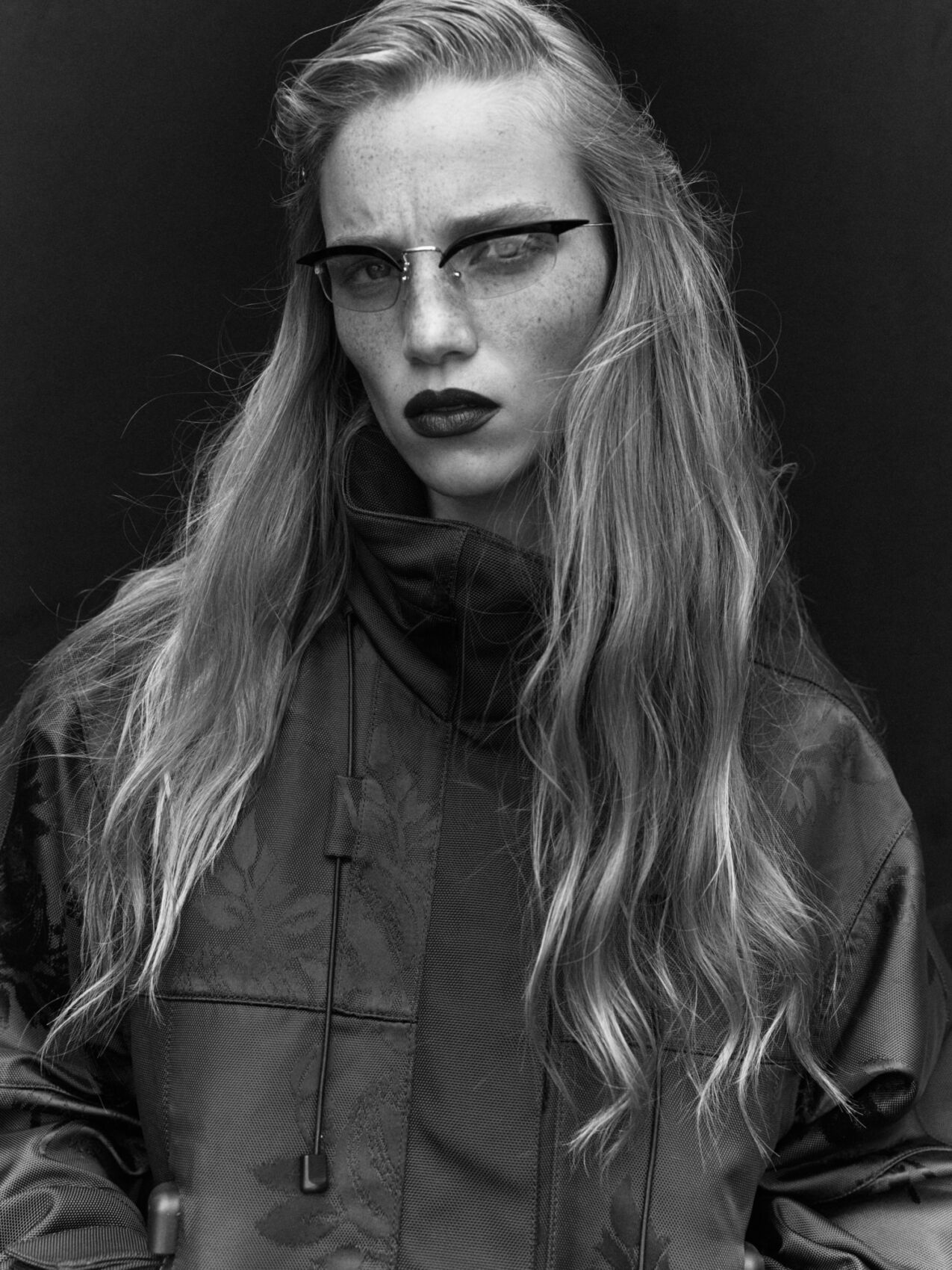 A person with long, textured hair stares forward with a serious expression. They wear frameless glasses and dark lipstick, enhancing their striking features. The individual is dressed in a patterned jacket with a high collar, exhibiting a blend of modern and classic styles. The monochrome tones emphasize the interplay of light and shadow on their face and clothing.