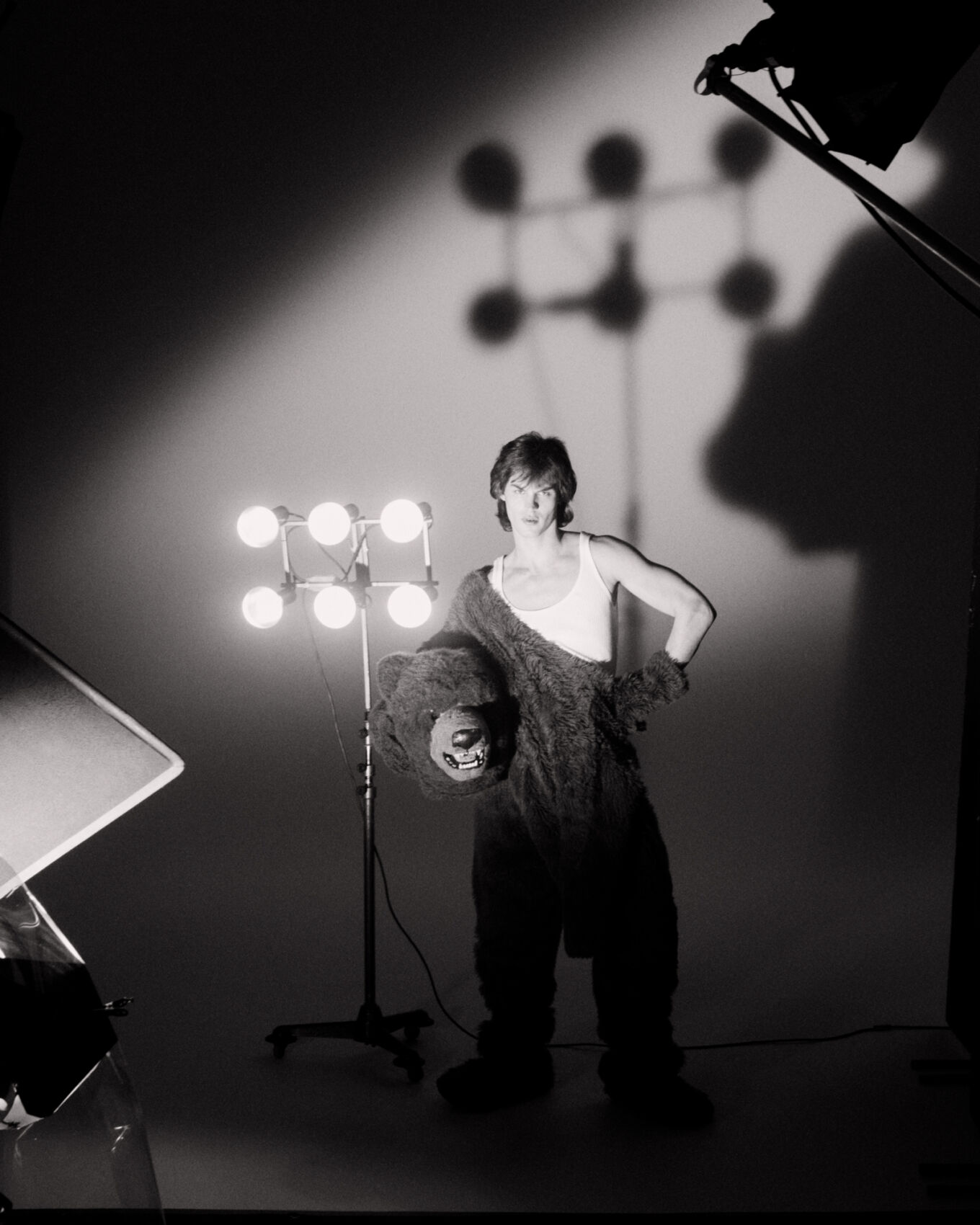 A person stands in a studio, wearing a half-taken-off gorilla suit, revealing a tank top beneath. Bright stage lights are directed at them, casting large shadows on the wall. The scene has a film set atmosphere, with equipment like stands and light panels visible. The black and white composition creates a dramatic and theatrical setting.