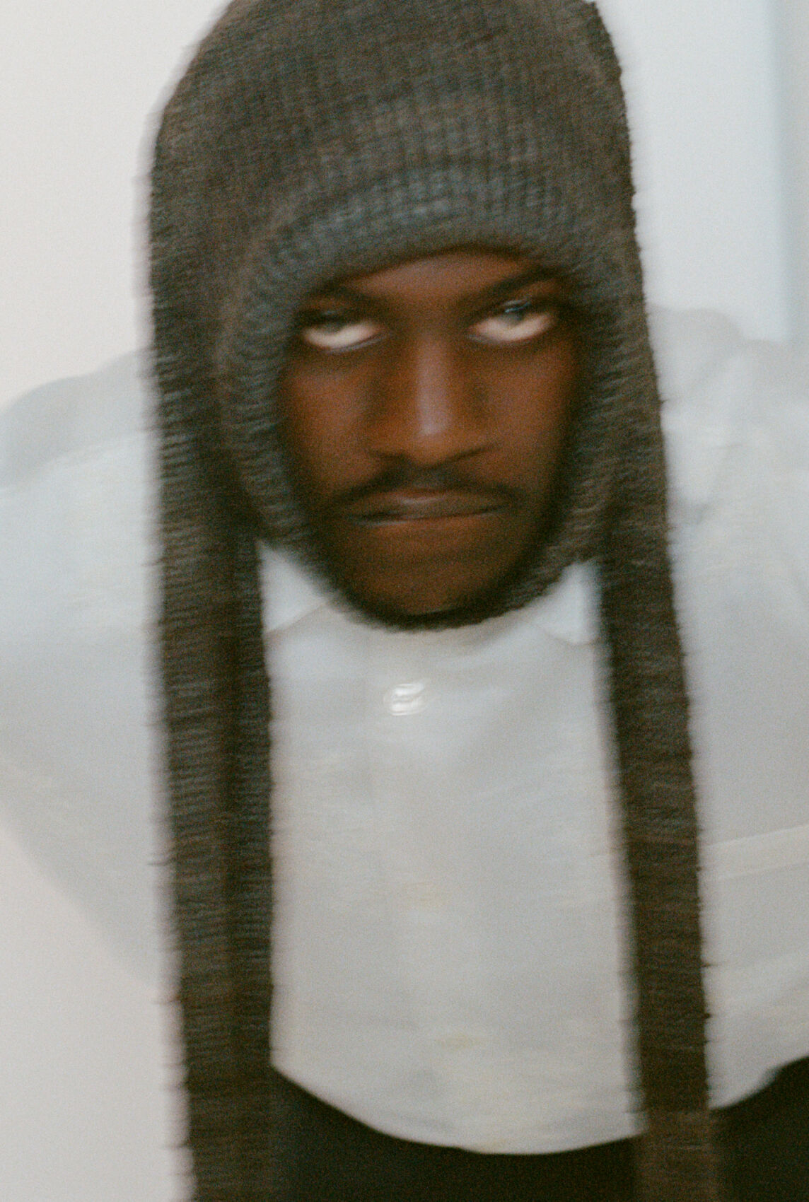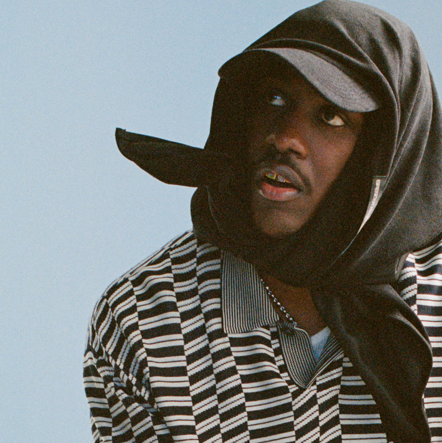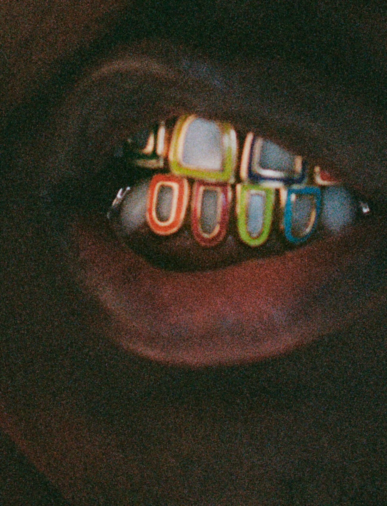 A close-cropped portrait shows a man gazing slightly sideways beneath a red-and-white checked hood. His skin glows under soft daylight, lips parted to reveal gold dental jewellery. One hand lifts the fabric near his cheek, displaying chunky silver rings and a watch. The mood feels intimate, confident, and quietly luxurious, blending street influence with refined styling.