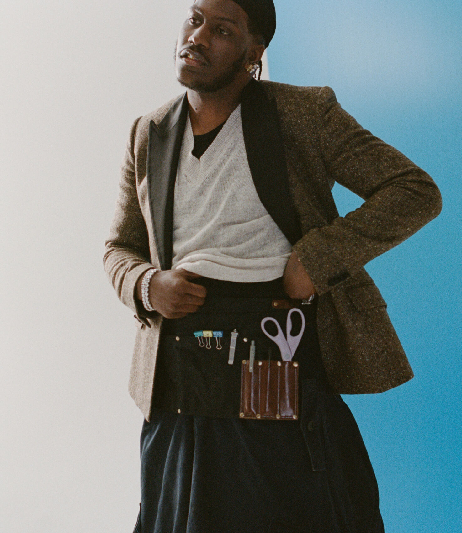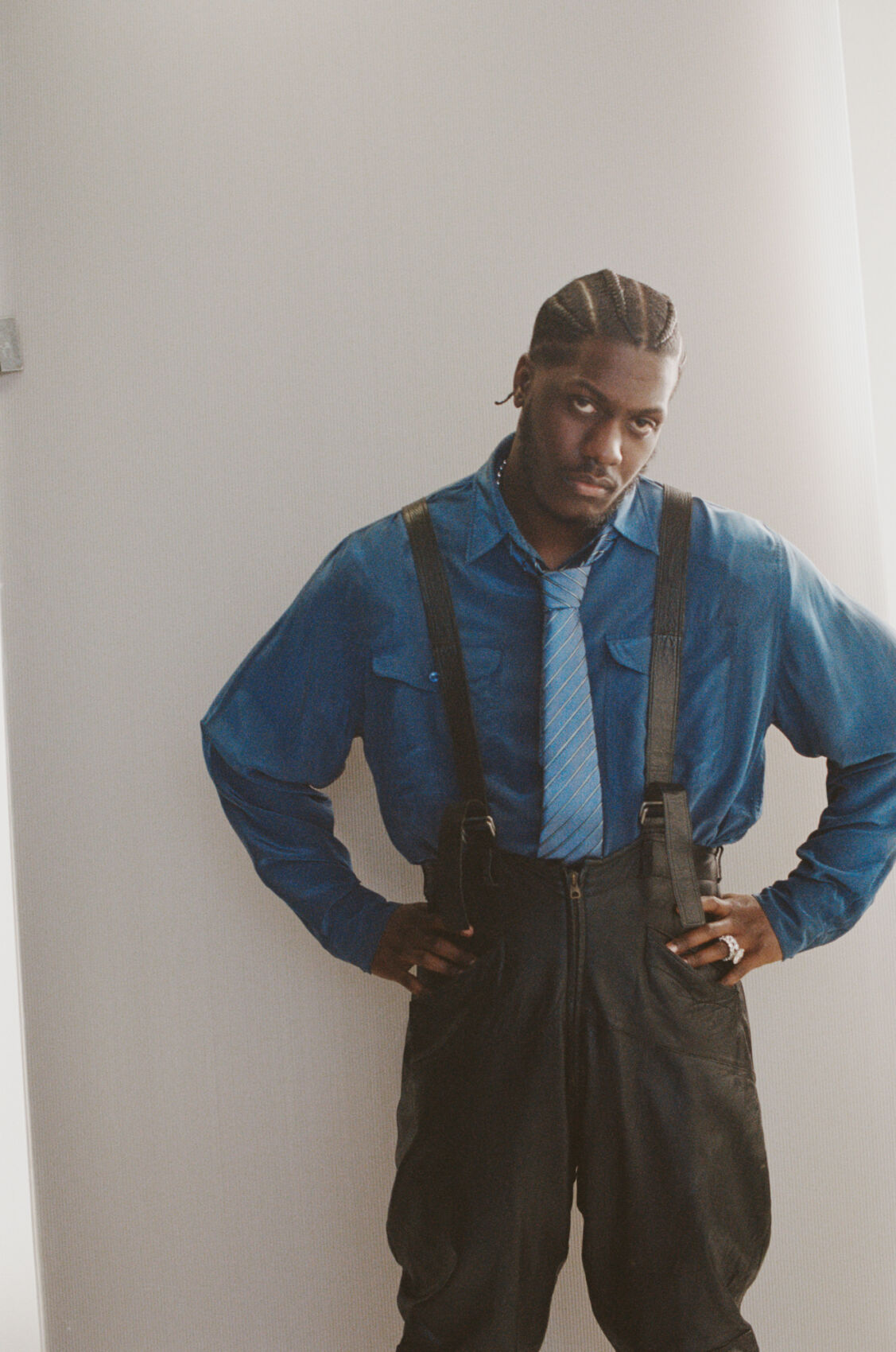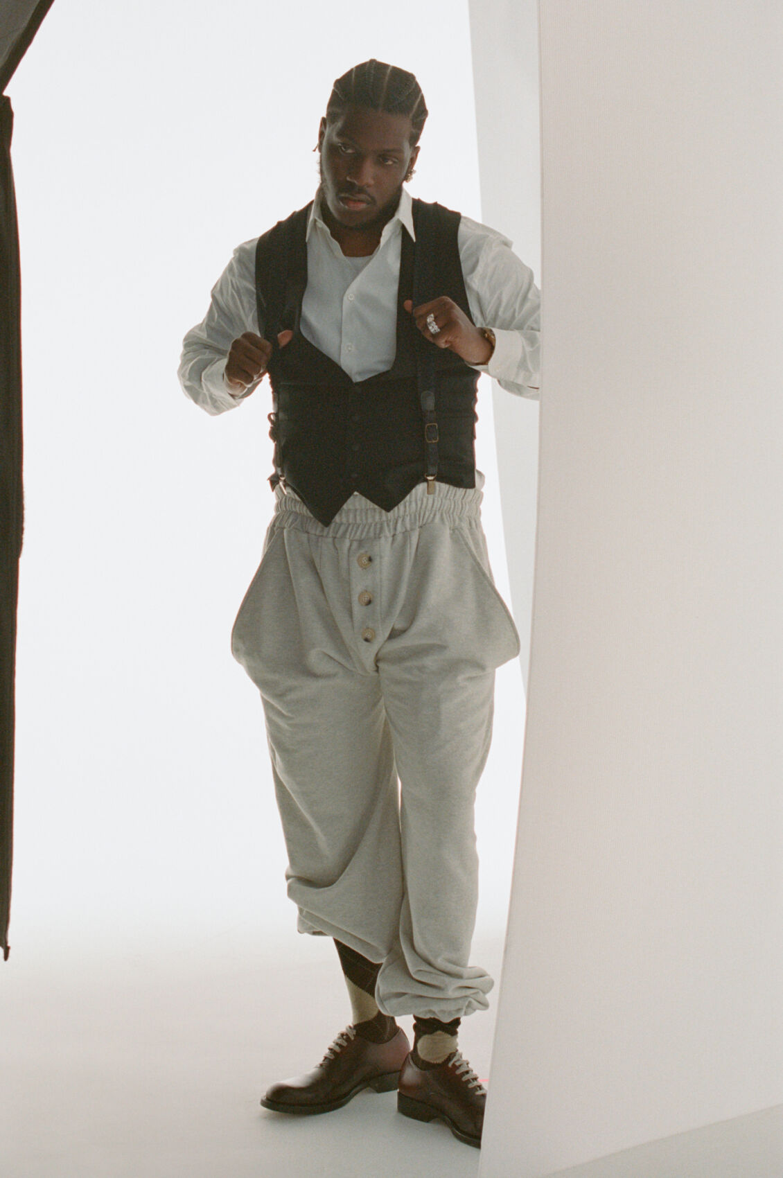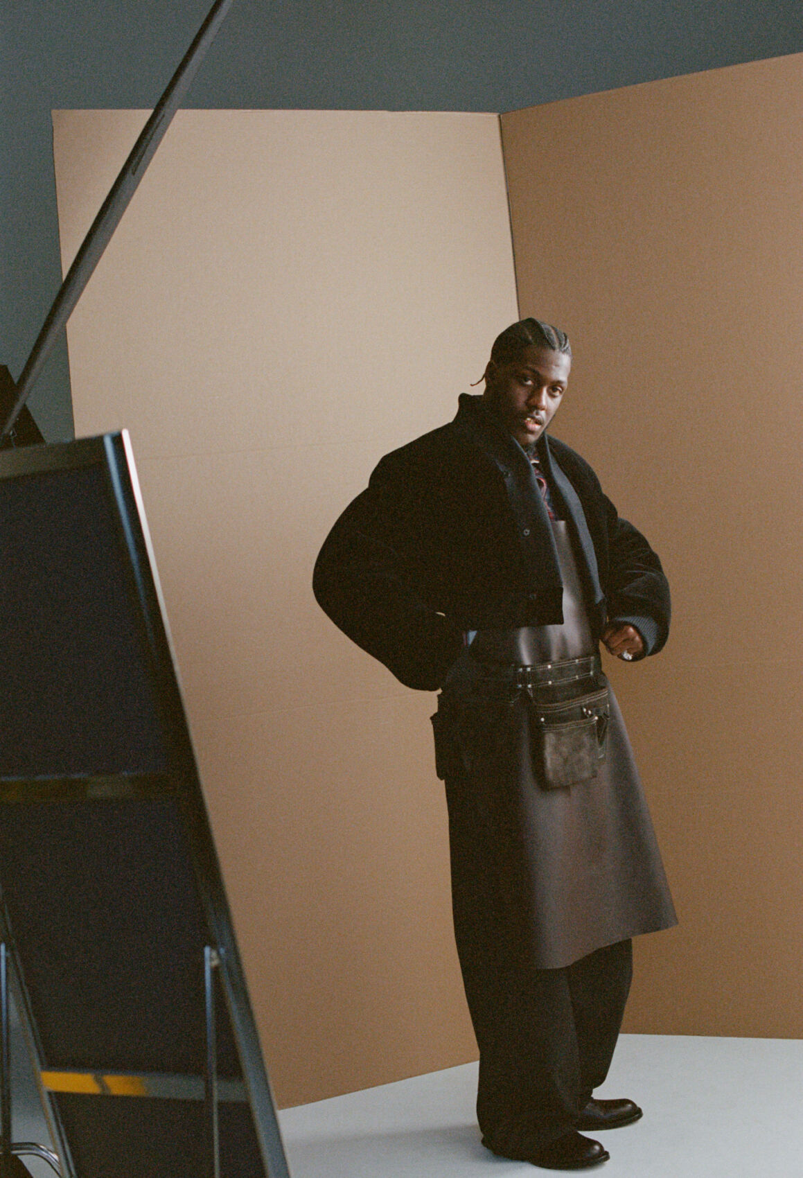 A close-cropped portrait shows a man gazing slightly sideways beneath a red-and-white checked hood. His skin glows under soft daylight, lips parted to reveal gold dental jewellery. One hand lifts the fabric near his cheek, displaying chunky silver rings and a watch. The mood feels intimate, confident, and quietly luxurious, blending street influence with refined styling.
