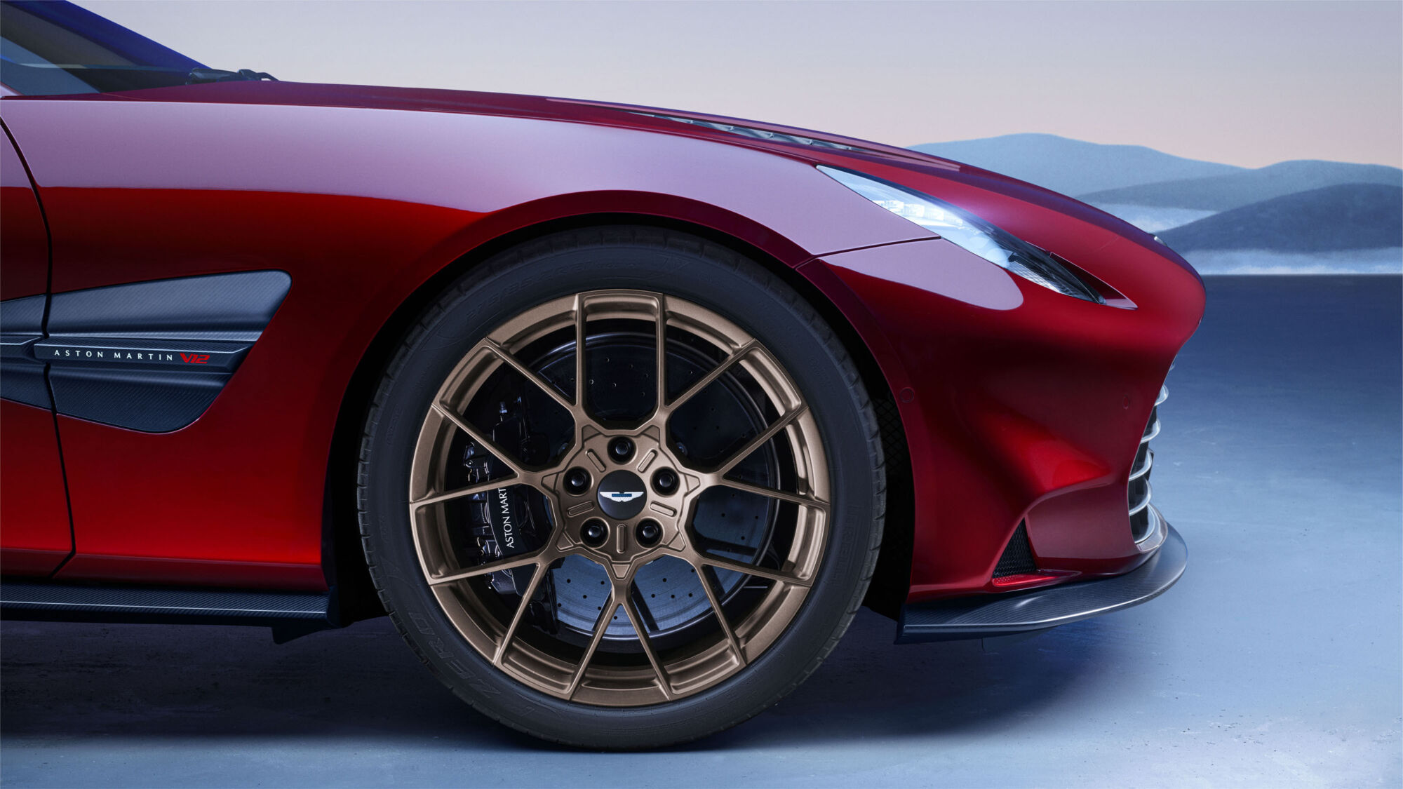A sleek, red sports car exudes elegance with its smooth curves and glossy finish. The focus is on its front section, where an intricate, gold-colored alloy wheel stands out. The background features a serene, muted landscape with soft, gradient hues of blue and gray, hinting at distant hills under a calm sky, creating a dynamic yet tranquil scene.