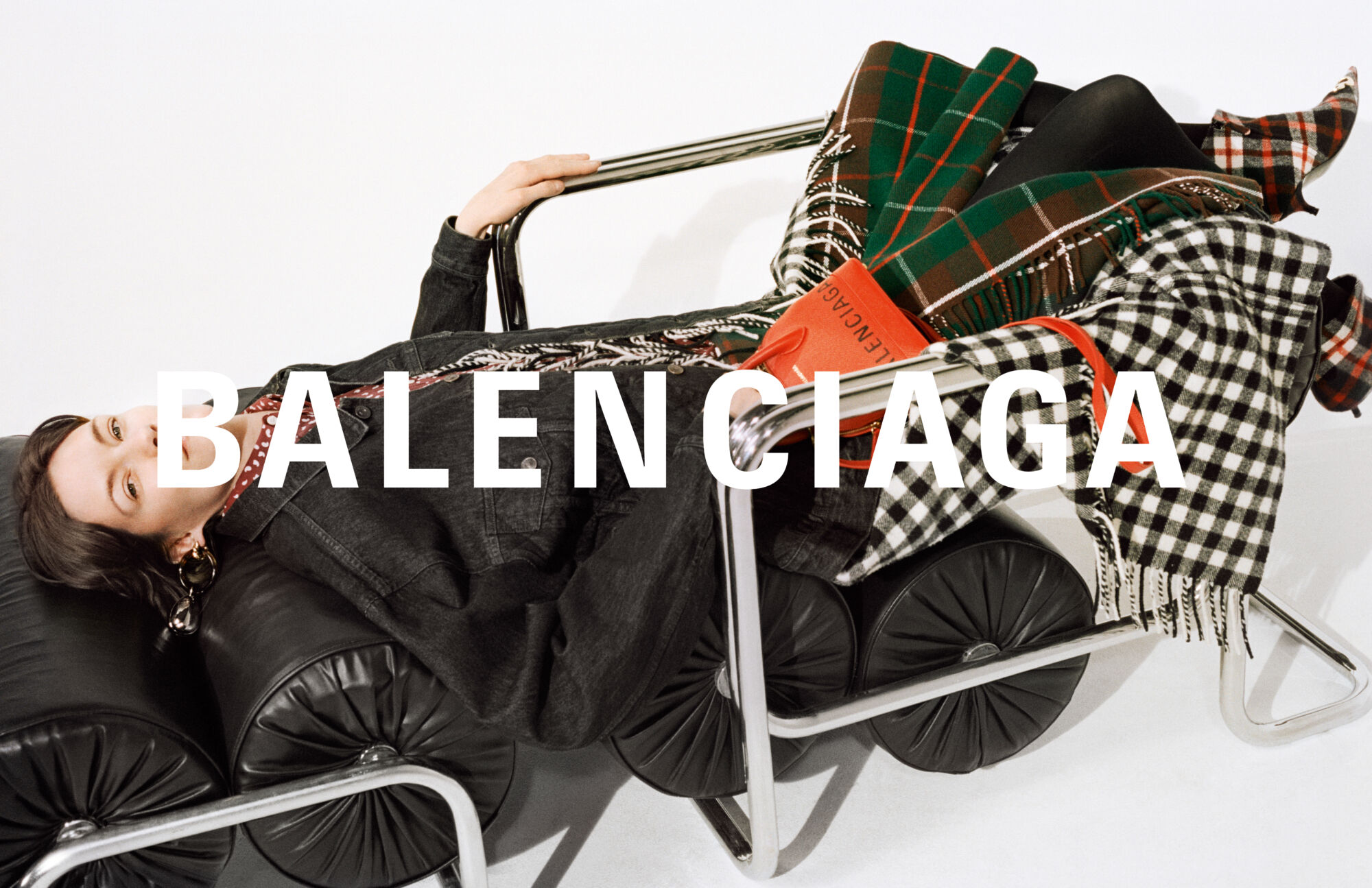A person reclines on a modern, metal-framed chair with cylindrical cushions. They wear a dark outfit, possibly denim, and accessorize with large, noticeable earrings. Plaid and checked patterned fabrics, along with a vibrant red accessory, cover part of the chair. The setup has a stylish and contemporary aesthetic, focusing on a blend of textures and prints.
