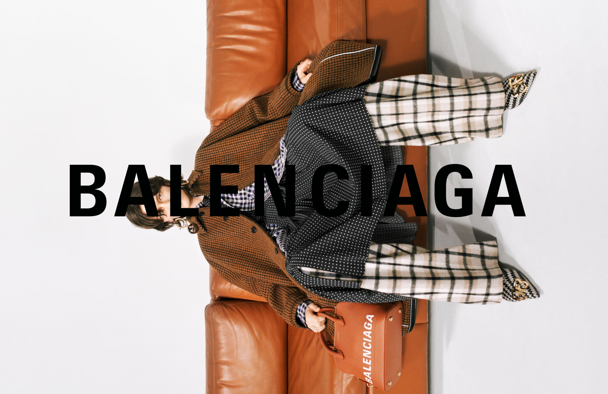 A person sits on an orange leather couch, dressed in a brown coat over a patterned top and wide-legged, black-and-white plaid pants. The ensemble includes pointed, checkered shoes. The fashion-forward outfit displays a mix of textures and patterns, creating a bold, eclectic look. The angle from above adds a unique perspective to the setting.