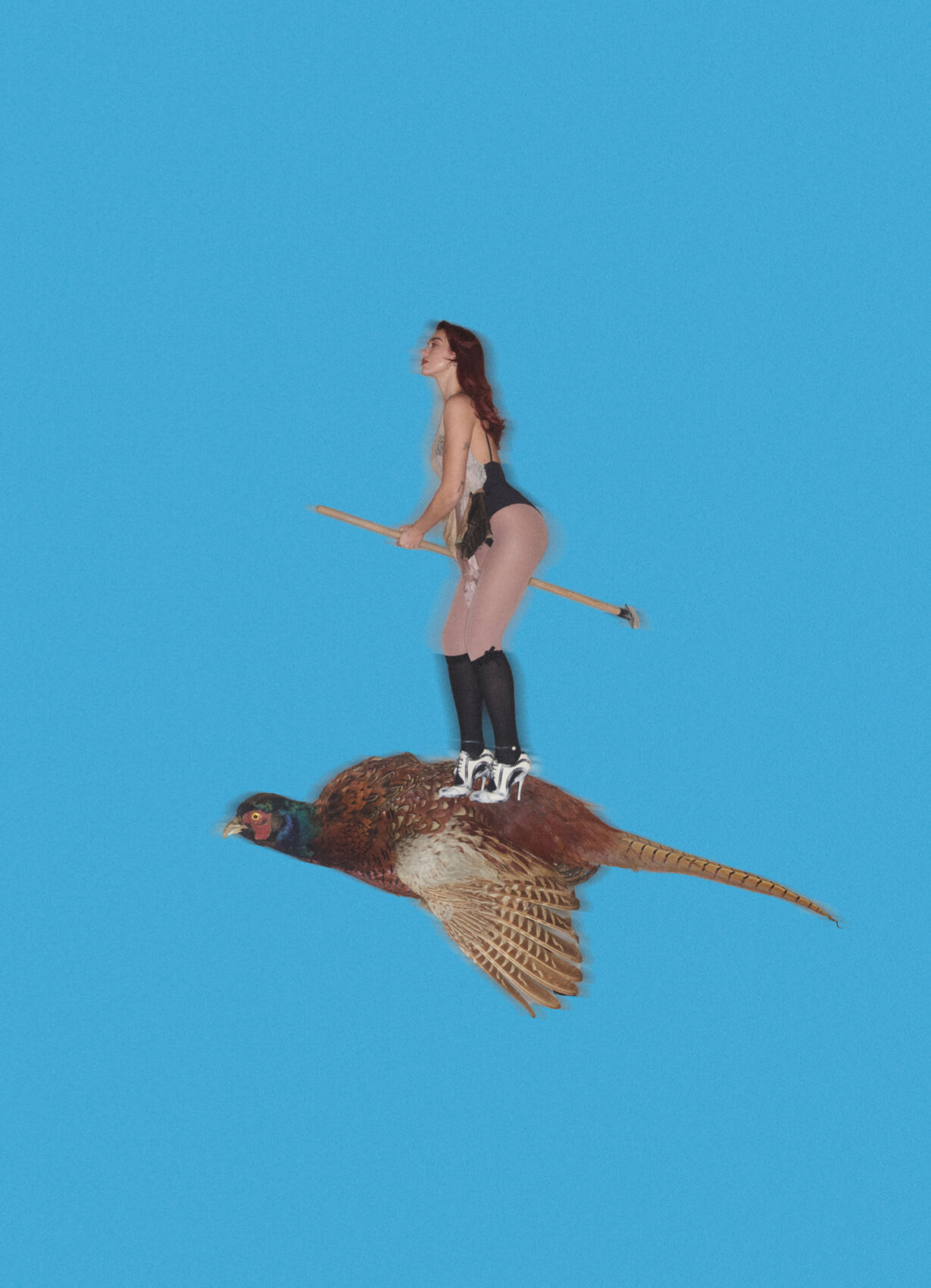 A woman is depicted balancing on a large bird, holding a broomstick. She wears a black and beige outfit with knee-high boots. The background is a clear blue, giving a whimsical and surreal feel. The bird appears to be mid-flight, enhancing the unusual and imaginative nature of the scene.