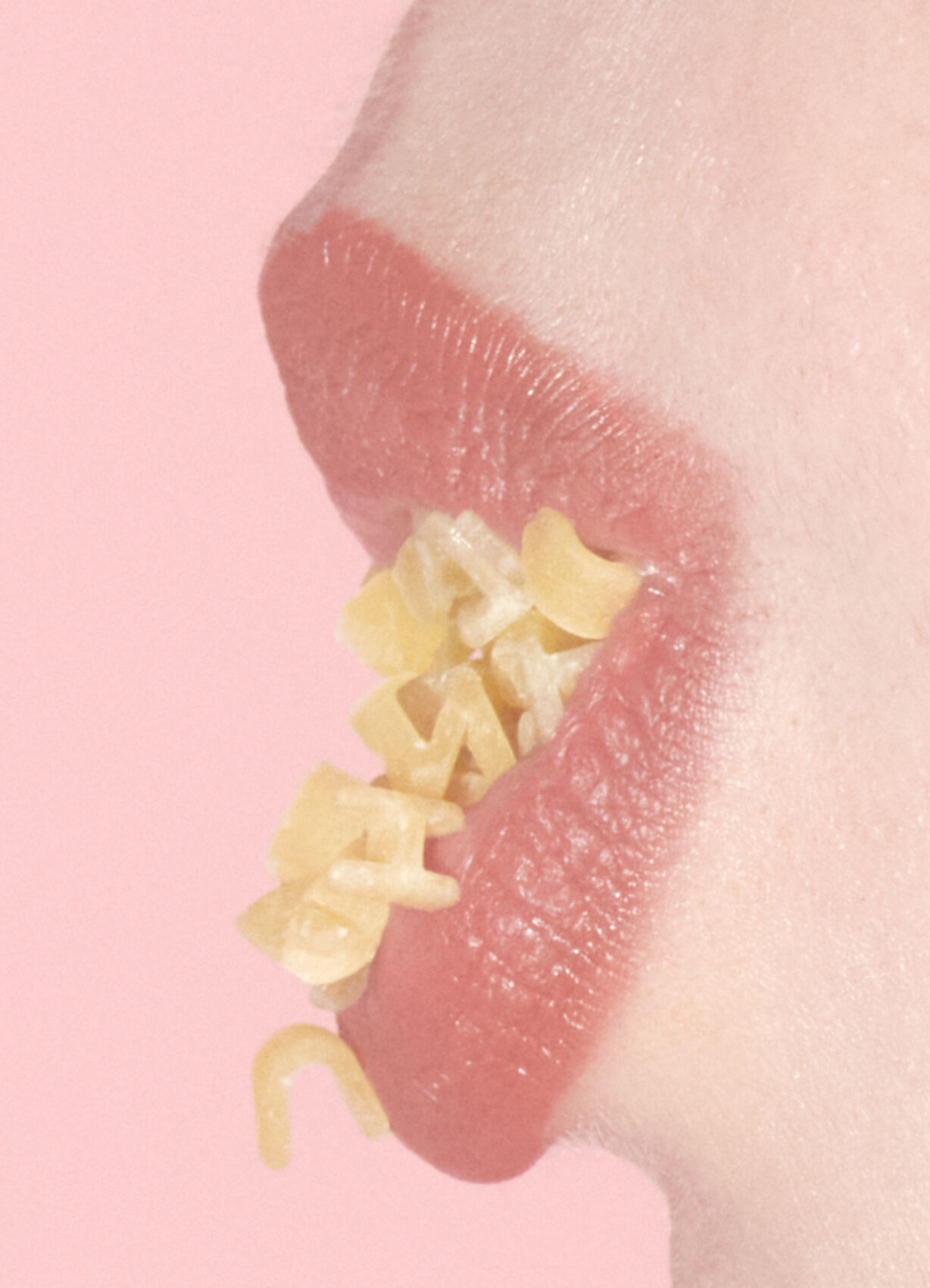 A close-up view focuses on parted lips, with a shade of soft pink, slightly glossy in texture. Nestled between them are small, randomly shaped bits of macaroni, their pale yellow contrasting gently against the lips. The background is a uniform pastel pink, enhancing the subtle, artistic quality of the composition.