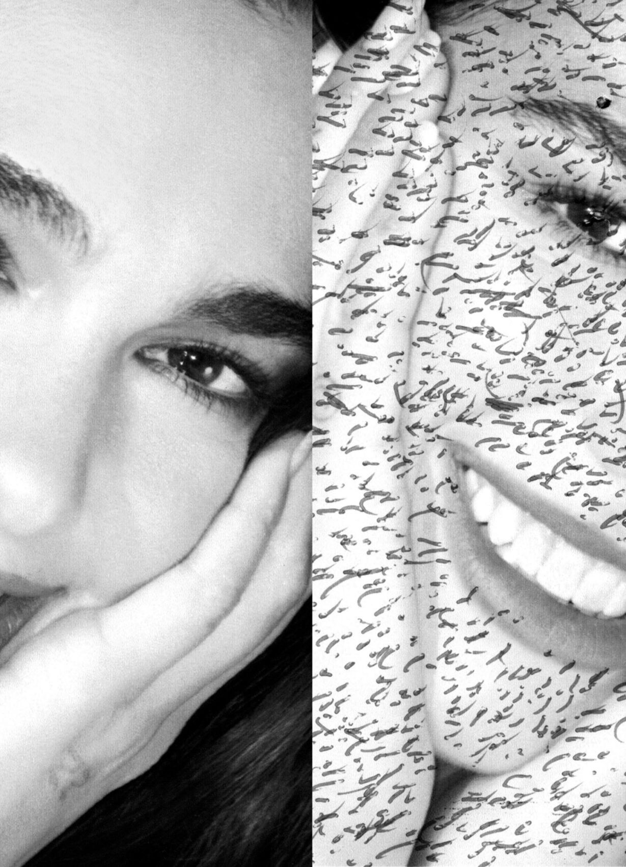 Two contrasting halves form a captivating composition. One half features a serene face with dark hair, resting a cheek upon a hand, conveying tranquility. The other half, imbued with lighter tones, reveals a bright smile overlaid with elegant, flowing script. The juxtaposition creates a compelling interplay of texture and emotion, blending realism and abstraction harmoniously.