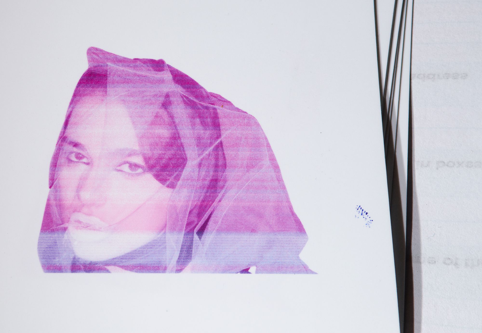 A semi-transparent, magenta-toned portrait dominates a white background. The artwork features a woman gazing forward, her head wrapped in translucent layered fabric that partially obscures her features. The play of light and shadow creates a mystical aura. To the side, a stack of papers enhances the contrast between the artistic subject and its surrounding space, adding depth.