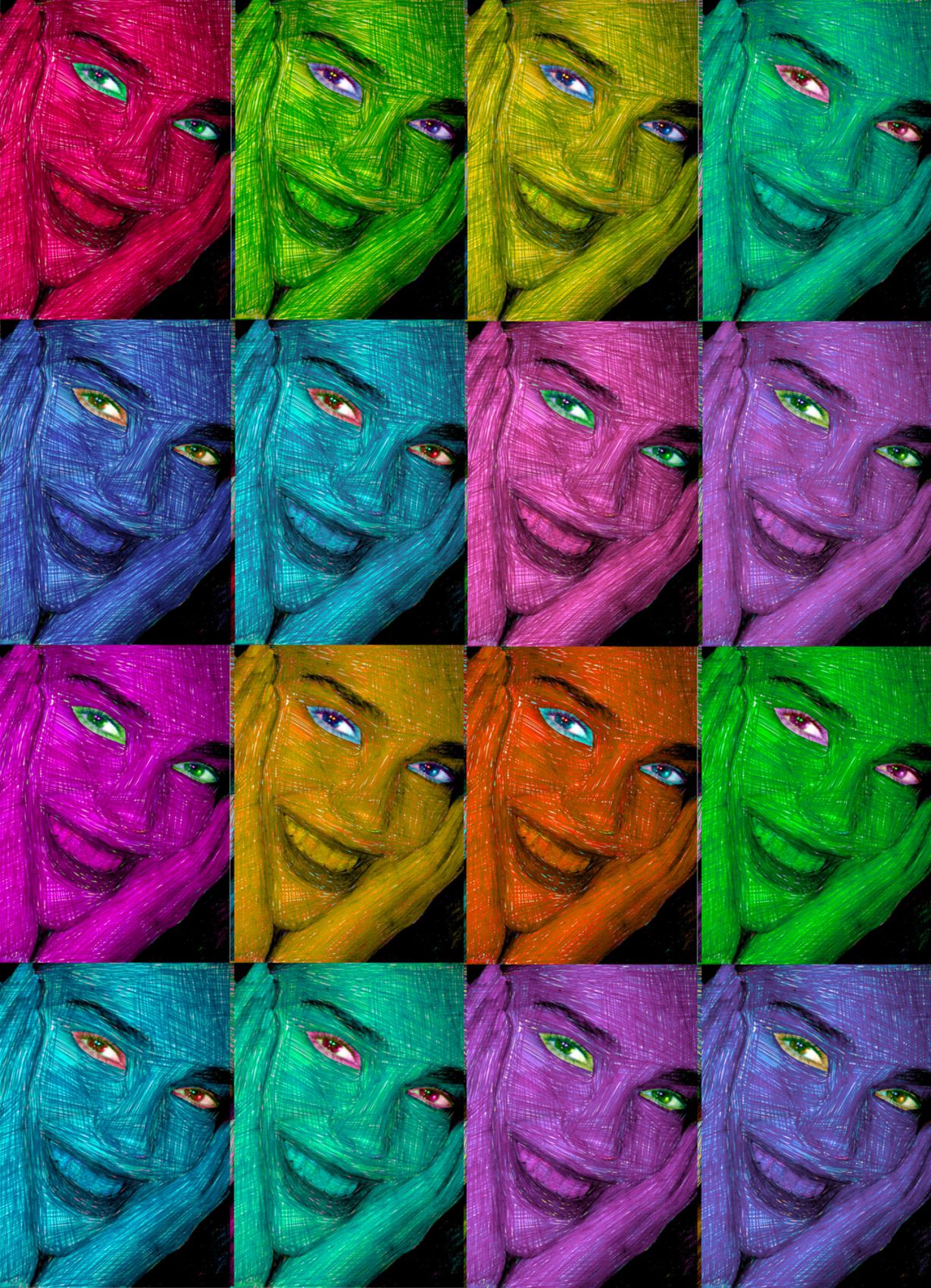 A vibrant grid features sixteen sections of the same person's lively expression. Each section displays a different bold color variation—green, pink, blue, orange, purple, and yellow—creating a striking pop art style. The artistic arrangement highlights the dynamic and playful mood through contrasting hues, with each square presenting a distinct, yet cohesive repetition of the individual's face.