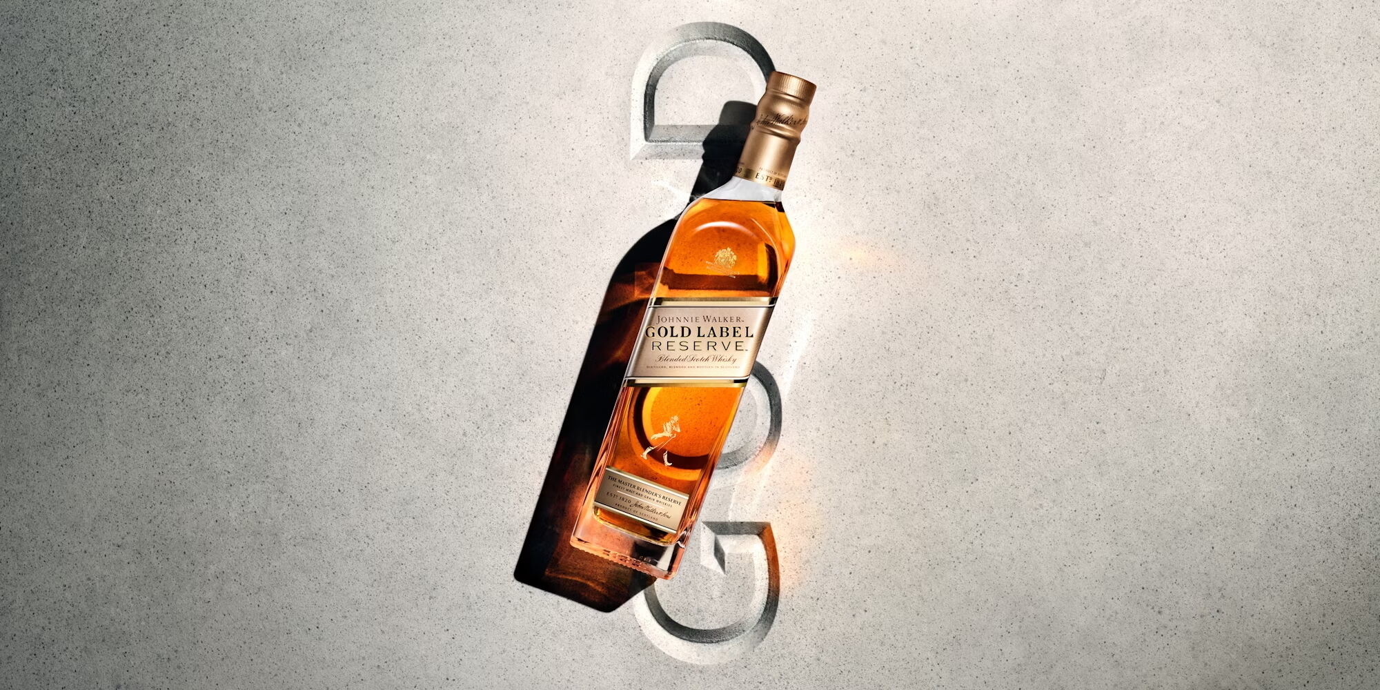 A bottle of amber-colored liquid rests on a light gray textured surface, casting a long, crisp shadow. The bottle features a sleek, rectangular shape with a golden cap. The glass reflects light, adding warmth to the scene. The background is simple, accentuating the bottle's elegant design and rich coloration against the clean backdrop.