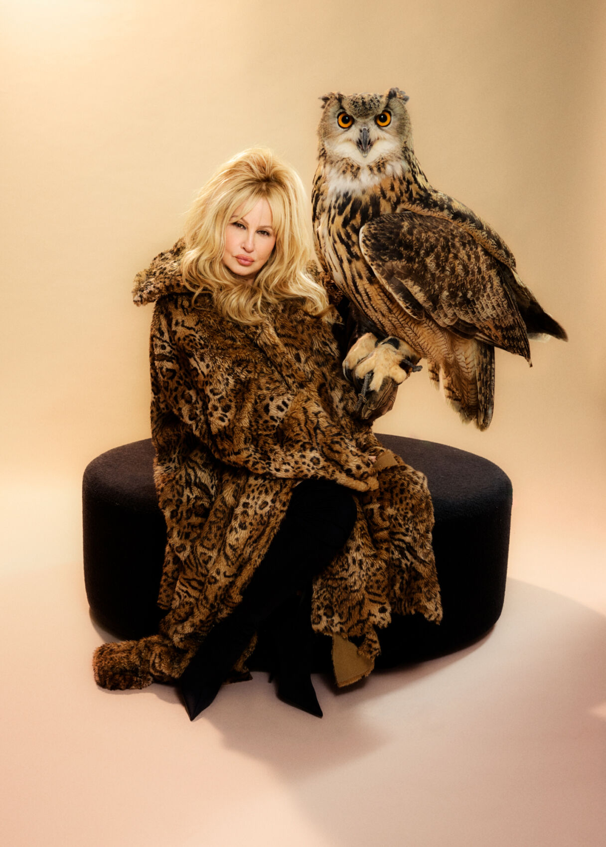 A woman with voluminous blonde hair sits gracefully on a rounded, dark ottoman. She wears an elegant, oversized leopard-print coat, exuding sophistication and poise. Beside her, a large owl with intense orange eyes perches calmly, adding a striking, mysterious touch. The neutral background emphasizes the luxurious textures and the captivating presence of both the woman and the owl.