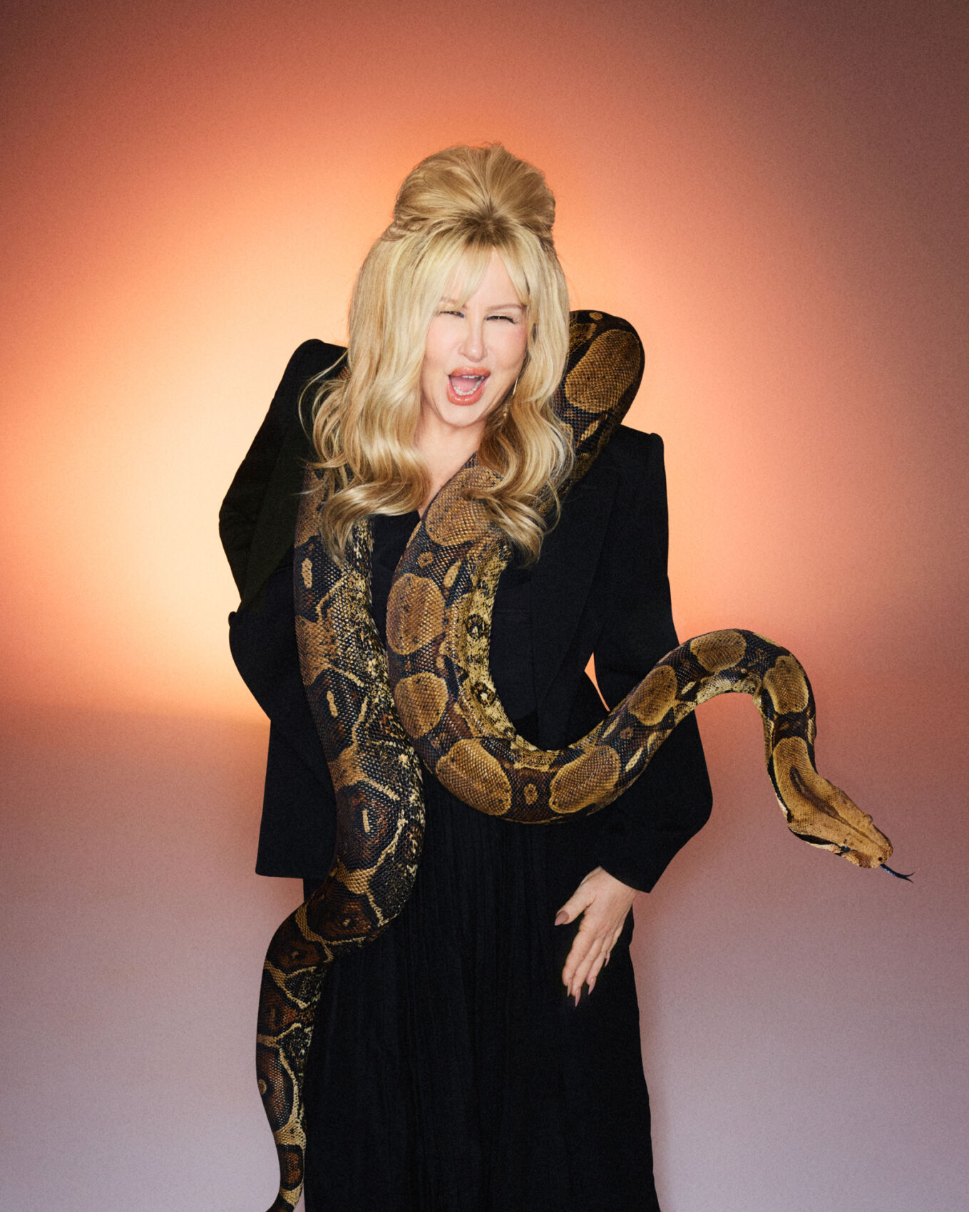 A person with long, wavy blonde hair, styled in a voluminous updo, stands confidently with a large, patterned snake draped over their shoulders. They wear a dark outfit with broad shoulders, and their expression appears lively and playful. The background features a warm gradient of orange and purple hues, adding to the dramatic and bold atmosphere.
