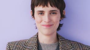 A person with wavy hair wearing a dark blazer over a white top. Beneath the blazer, a hint of hosiery is visible. The outfit is stylish, combining formal and casual elements. The background is a muted brown, highlighting the attire. The overall ambiance is chic and modern, focusing on fashion-forward presentation.