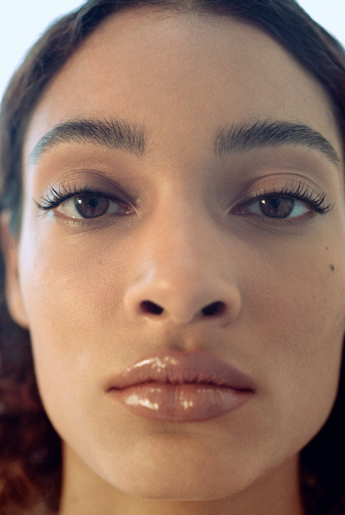 A close-up view showcases a person with smooth, glowing skin and a serene expression. The eyes have long, delicate lashes, and the eyebrows are well-groomed. The lips are glossy and slightly parted. Subtle natural lighting enhances the gentle contours of the face, casting a soft shadow and highlighting the even skin tone and delicate features.