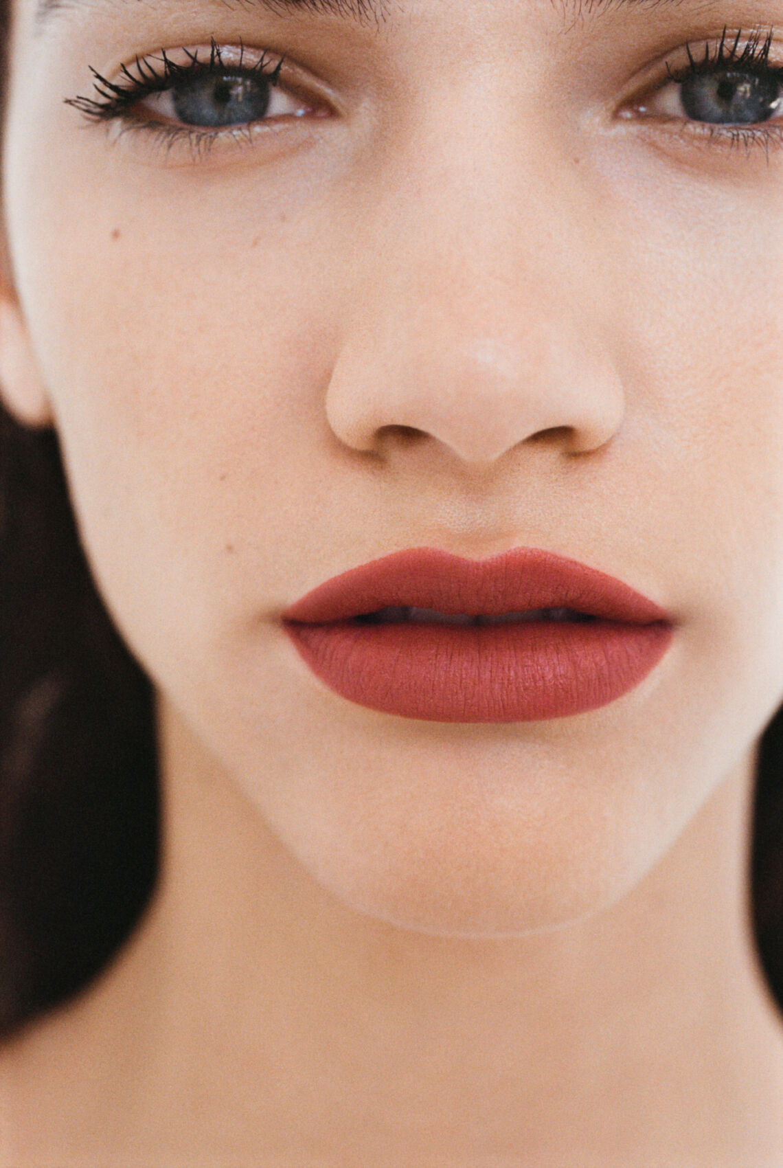 A person with curly brown hair is depicted with a focus on their face. Their expression is neutral, and they wear bold, matte red lipstick. The skin appears smooth and even-toned. The eyebrows are well-groomed, and the eyes are accentuated with long, dark eyelashes. Soft lighting enhances their features against a neutral background.