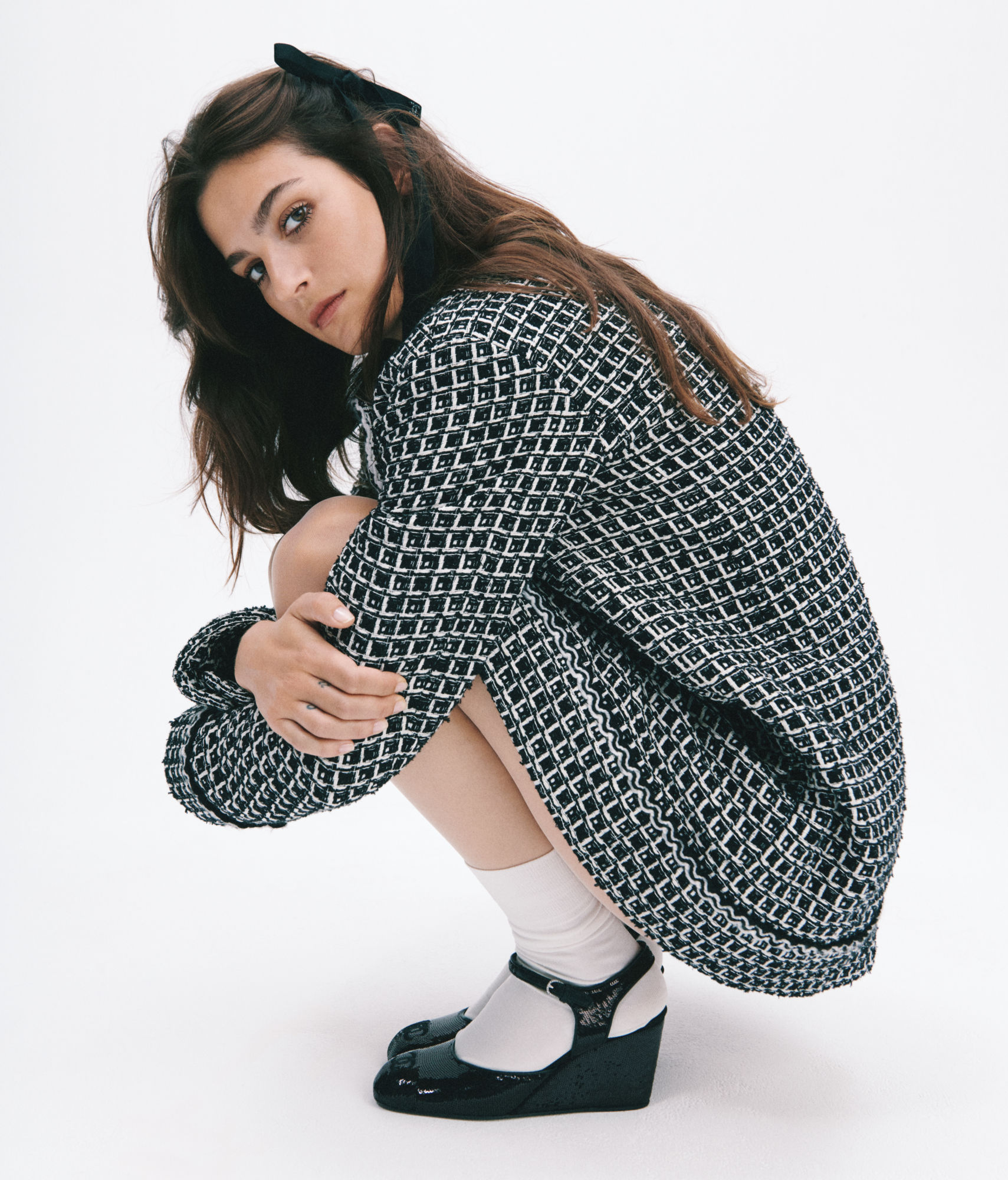 A woman with long brown hair crouches, wearing a black and white checkered outfit. Her gaze is directed at the viewer, and she has a subtle expression. Her feet are adorned with black wedge shoes and white socks. The background is plain white, emphasizing her pose and style. A black bow accessory is worn in her hair.