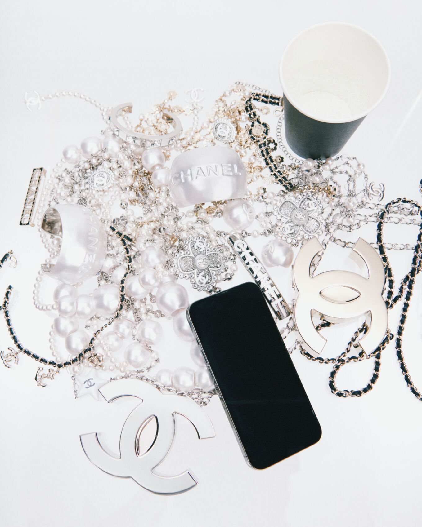 A collection of jewelry featuring intricate designs, including pearl-like beads, metallic chains, and ornate pendants, is spread out. A sleek black smartphone lies among the accessories, which also include bangles and large decorative elements. Nearby, a black and white disposable cup sits, contributing to the overall chic and cluttered composition on a reflective surface.