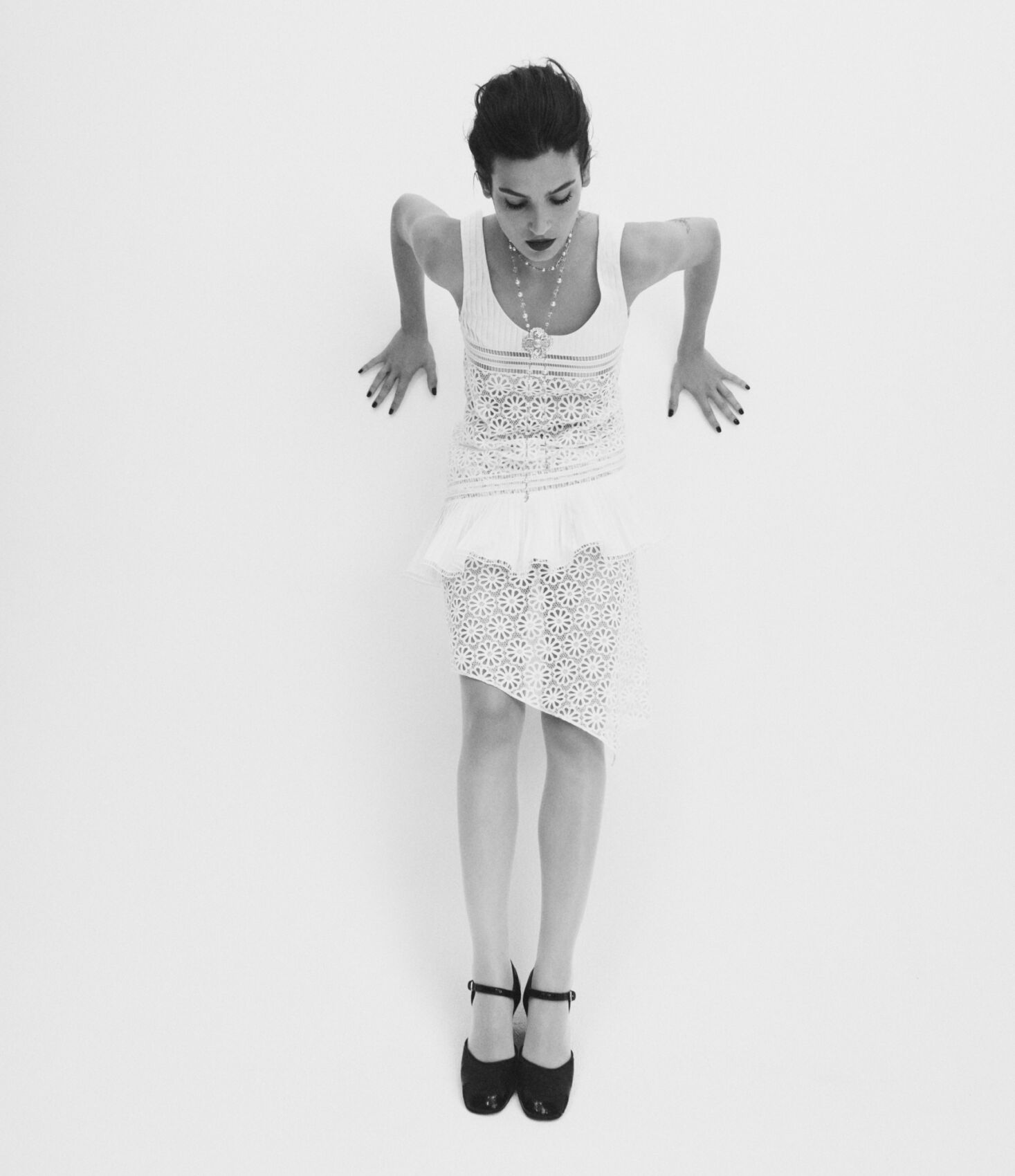 A woman with short, dark hair leans against a white background, looking downward. She wears a sleeveless, fitted dress with intricate patterns, featuring a peplum detail around the waist. Her dark heels contrast with the light attire. Her expression is focused, and she accessorizes with layered necklaces. Her confident pose gives an elegant yet edgy vibe.