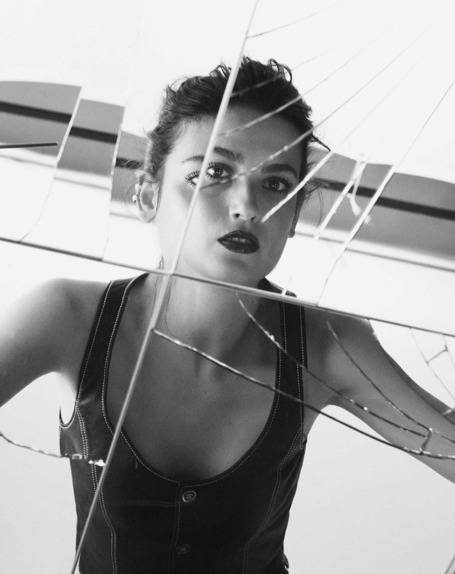 A woman with a serious expression looks through fragmented glass, which creates an intricate pattern around her. Her hair is styled up, and she wears a sleeveless top with visible stitching. The black-and-white composition emphasizes contrast and texture, adding an intense mood to the scene. The play of reflections and shadows creates a dramatic and dynamic effect.