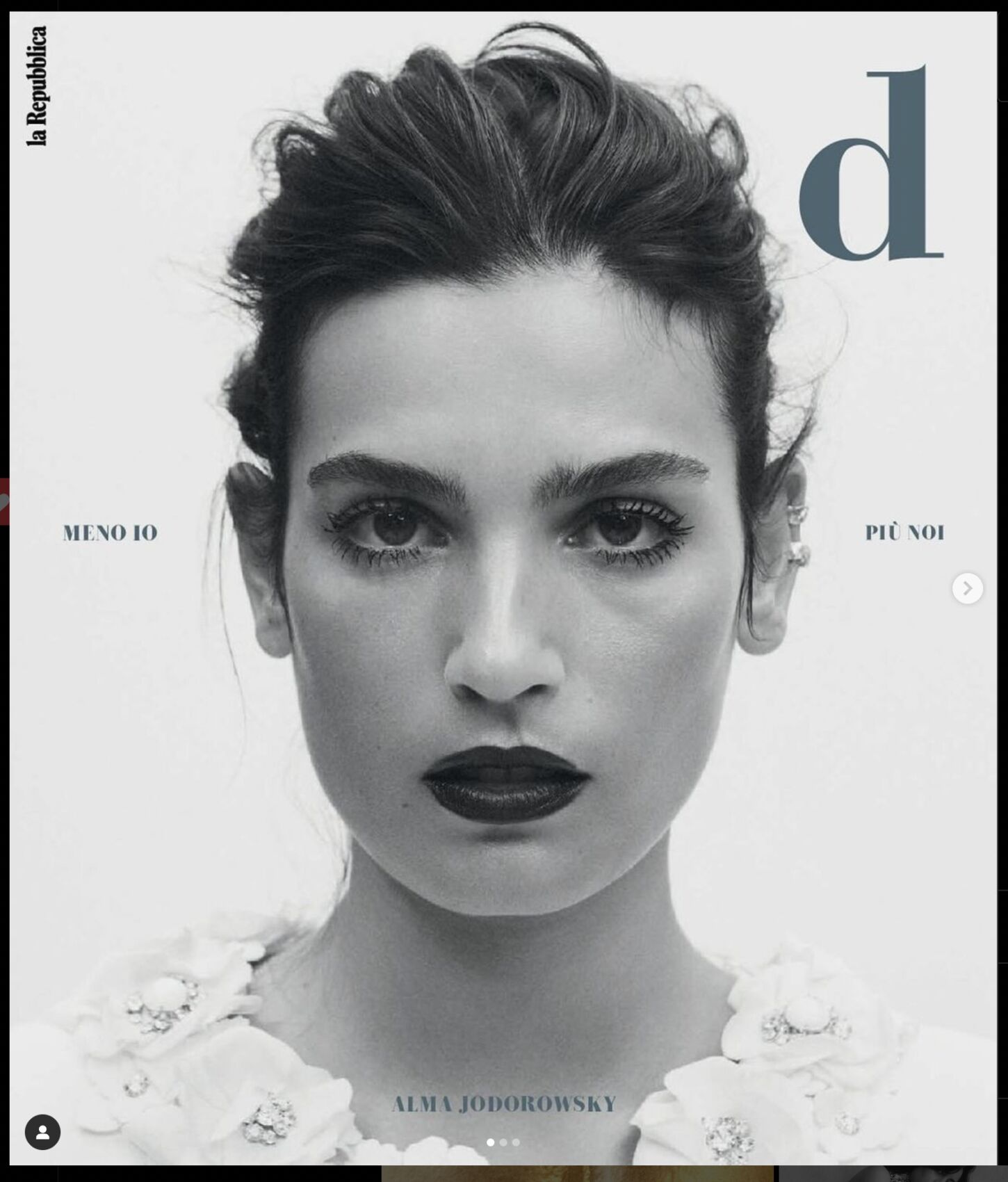 A young woman gazes forward with intensity, her dark, wavy hair swept back elegantly. She wears a floral-adorned top with white petals, adding a delicate touch. Her bold, dark lipstick and piercing eyes create a striking contrast against the soft grayscale tone, highlighting her features with a sense of depth and allure in this close-up.