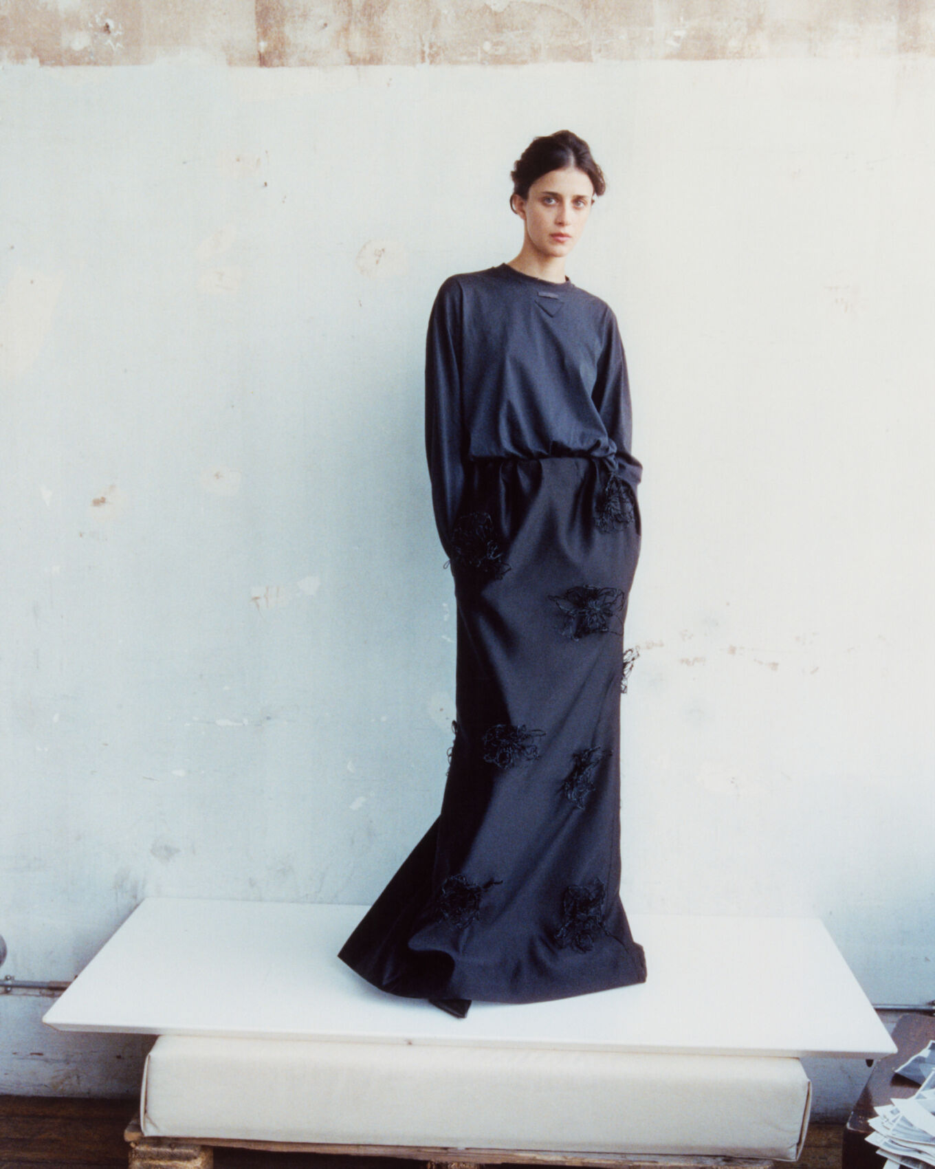 A person stands on a white platform, wearing a long, dark, elegant dress with floral embellishments. The dress has a soft, flowing design and long sleeves, with hands tucked into side pockets. The background features a faded, pale blue wall with a rustic texture, adding a subtle contrast to the refined look of the outfit.