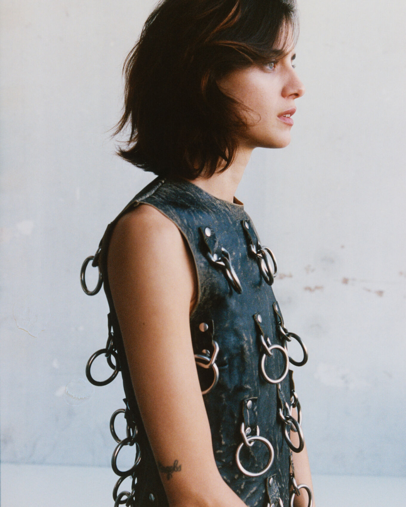 A person with shoulder-length dark hair is shown in profile, sporting a sleeveless, dark garment adorned with large metal rings. The garment appears to be made of a textured material. A small tattoo can be seen on their arm. The background is a muted, faded gray, suggesting an industrial or minimalist setting. The overall tone is edgy and artistic.
