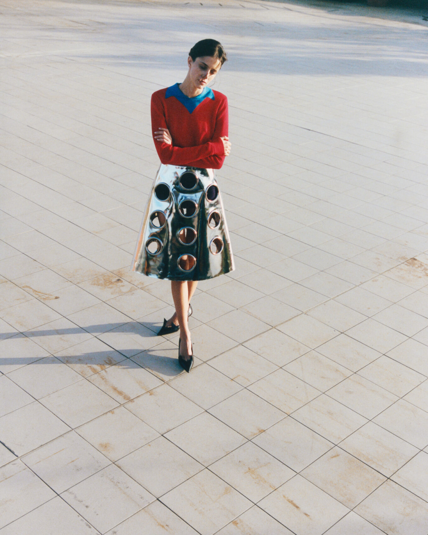 A person stands on tiled ground, casting a long shadow. They're dressed in a red top with blue accents and a striking metallic skirt featuring circular cutouts. The skirt's reflective surface catches light, contrasting with the plain background. Their pose is relaxed yet thoughtful, with arms crossed and feet in black heels, emanating a modern, avant-garde vibe.