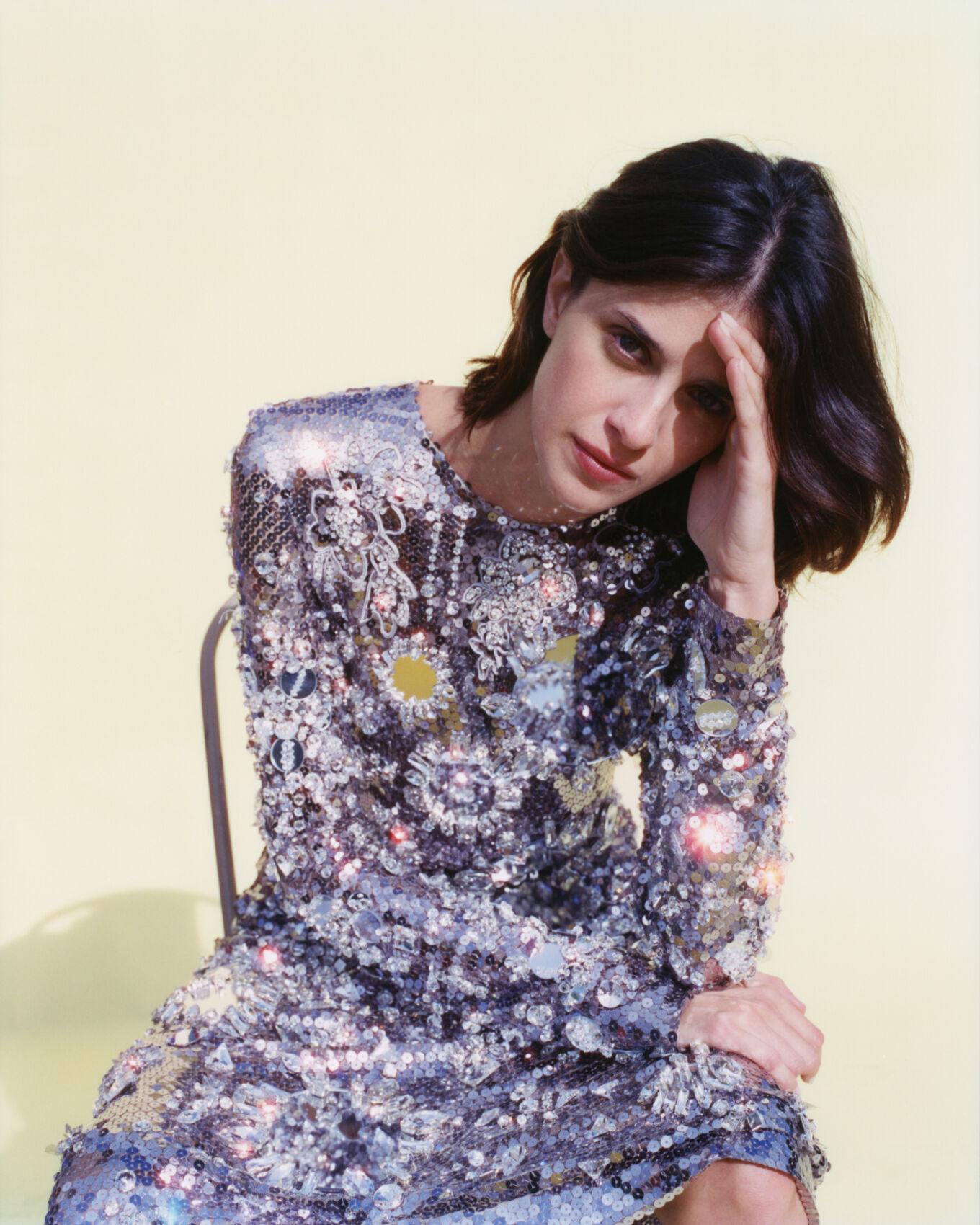 A person sits on a chair against a soft, pale background, wearing a dazzling, dazzlingly embellished dress covered in silver sequins and ornate patterns. Her hair is shoulder-length and dark, parted centrally. She rests her head on her hand, gazing thoughtfully forward, creating an introspective and contemplative mood. Light reflections create colorful sparks across the attire.