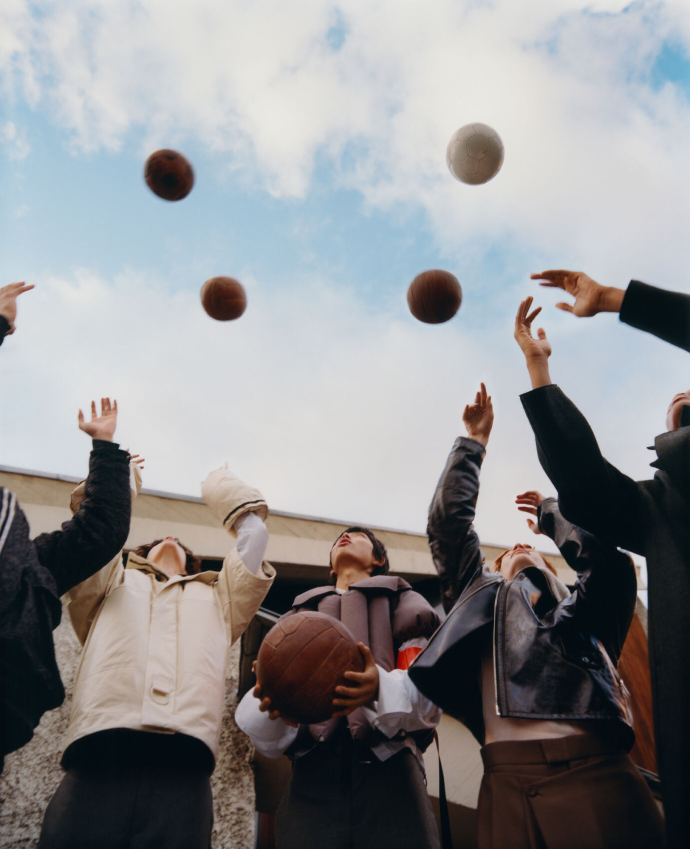A group of people stand outdoors, reaching upward as several balls are mid-air against a backdrop of a cloudy sky. They are wearing various jackets and coats, looking skyward with a sense of anticipation. The scene conveys energy and movement, capturing a moment of playful activity and communal interaction. Buildings are visible in the background.