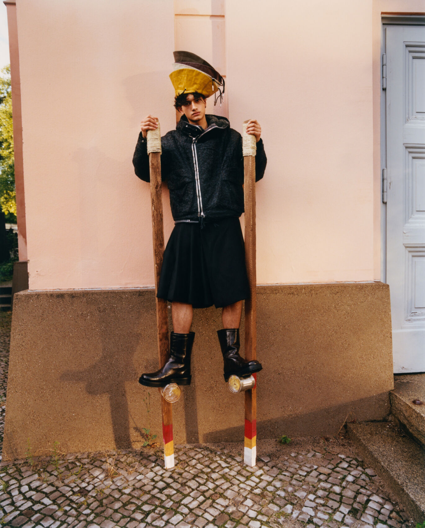A person stands on wooden stilts, leaning against a pastel pink wall. They wear a large, angular yellow hat and a dark, zippered jacket. Their outfit includes a knee-length, voluminous skirt paired with shiny black boots. The ground is cobbled, and a white door is partially visible to the side, contributing to a whimsical, avant-garde scene.
