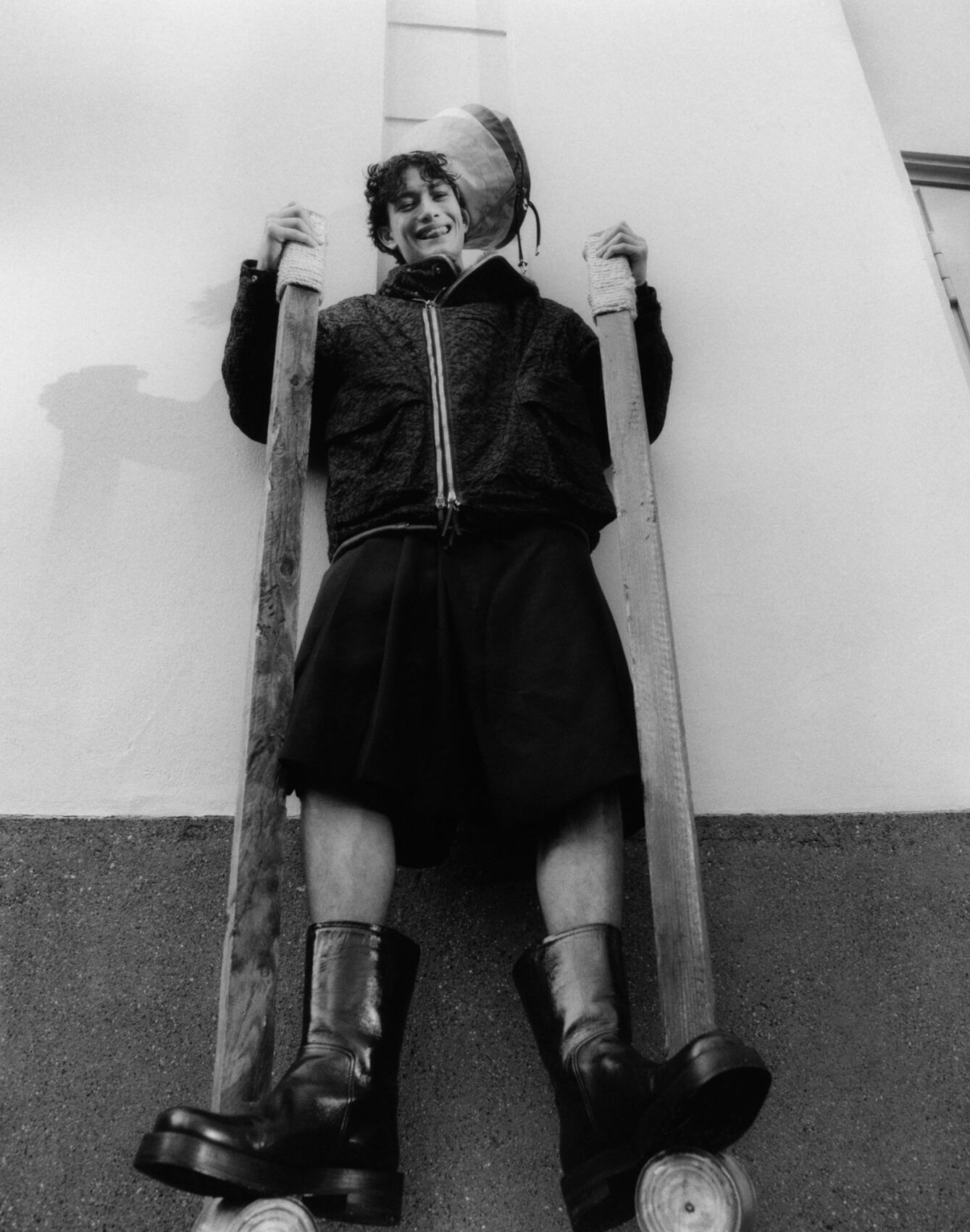 A person with curly hair smiles warmly while standing on tall stilts. Wearing a textured jacket, knee-length shorts, and chunky black boots, they hold the stilts with both hands. The background features a plain, light-colored wall with a small section of a doorway visible. The scene conveys a playful and adventurous atmosphere with an unusual perspective.