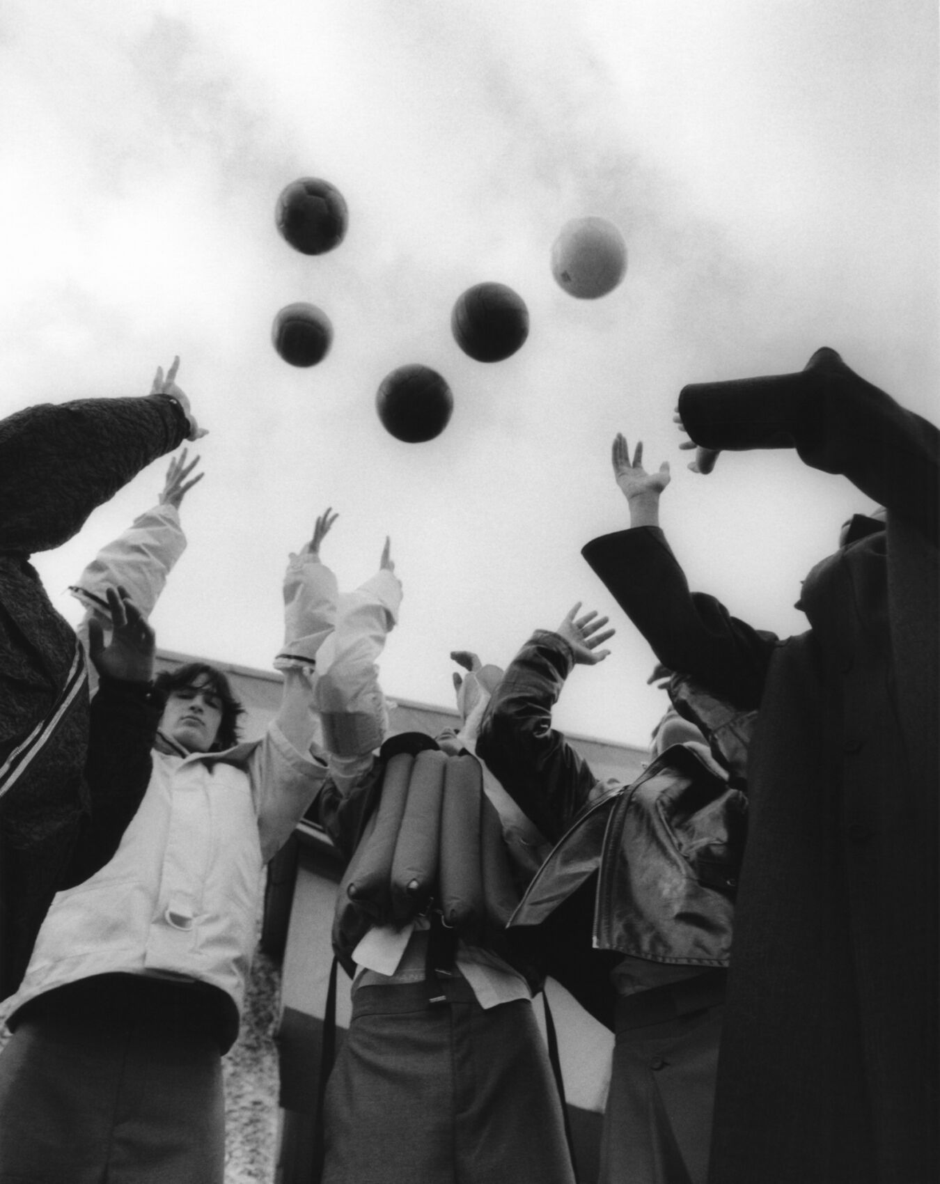Five people reach upwards towards several floating balls in a monochrome setting. The scene captures a dynamic moment, with each person dressed warmly in various jackets and coats. The angle provides an upward perspective, emphasizing the contrast between the dark clothing and the lighter sky. The composition conveys a playful, energetic atmosphere within an urban environment.