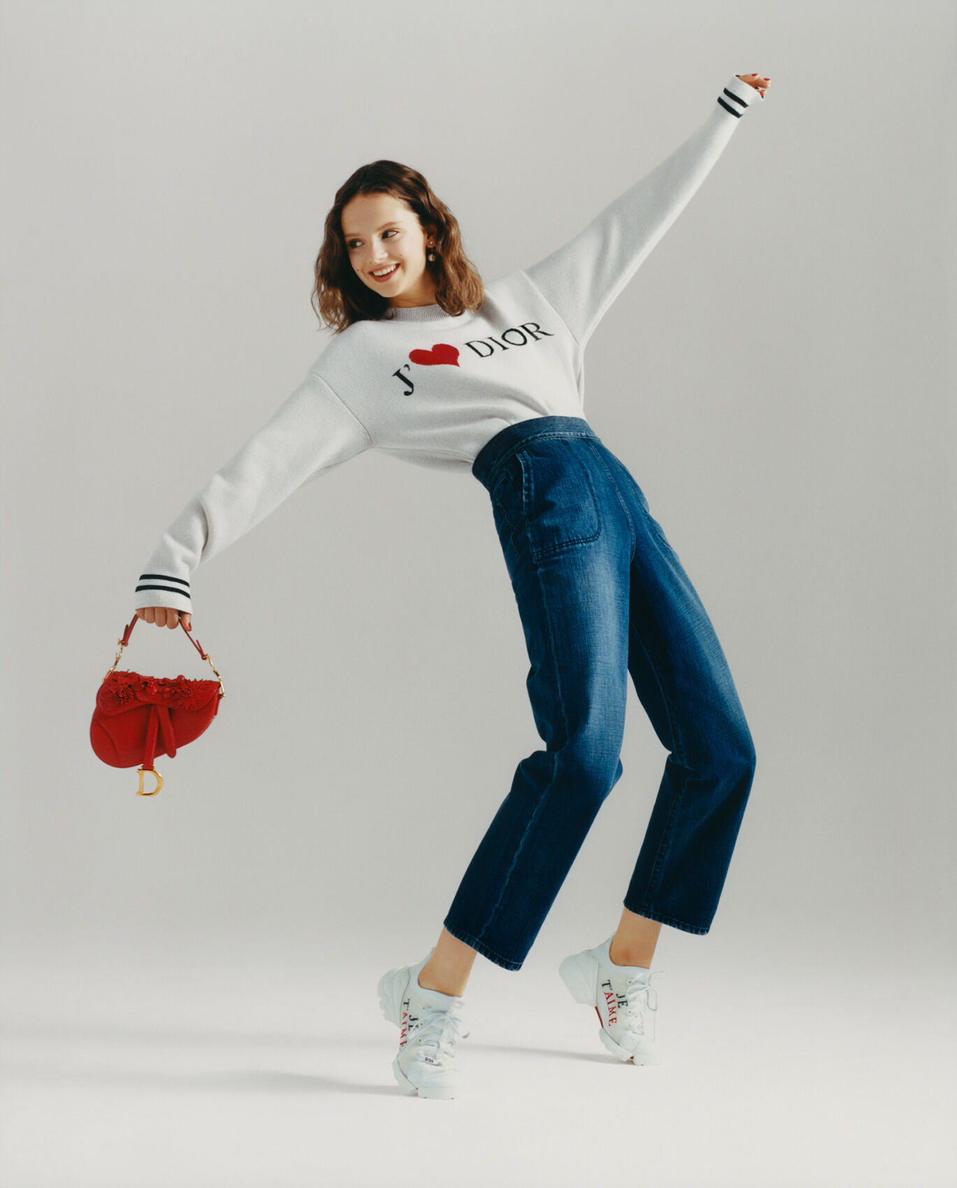 A person strikes a playful pose, wearing a white sweater and high-waisted blue jeans. They hold a small red purse in one hand. Their white sneakers add a casual touch. The background is plain, enhancing the outfit's features. The person's expression exudes joy, and their hair cascades over their shoulders in loose waves.