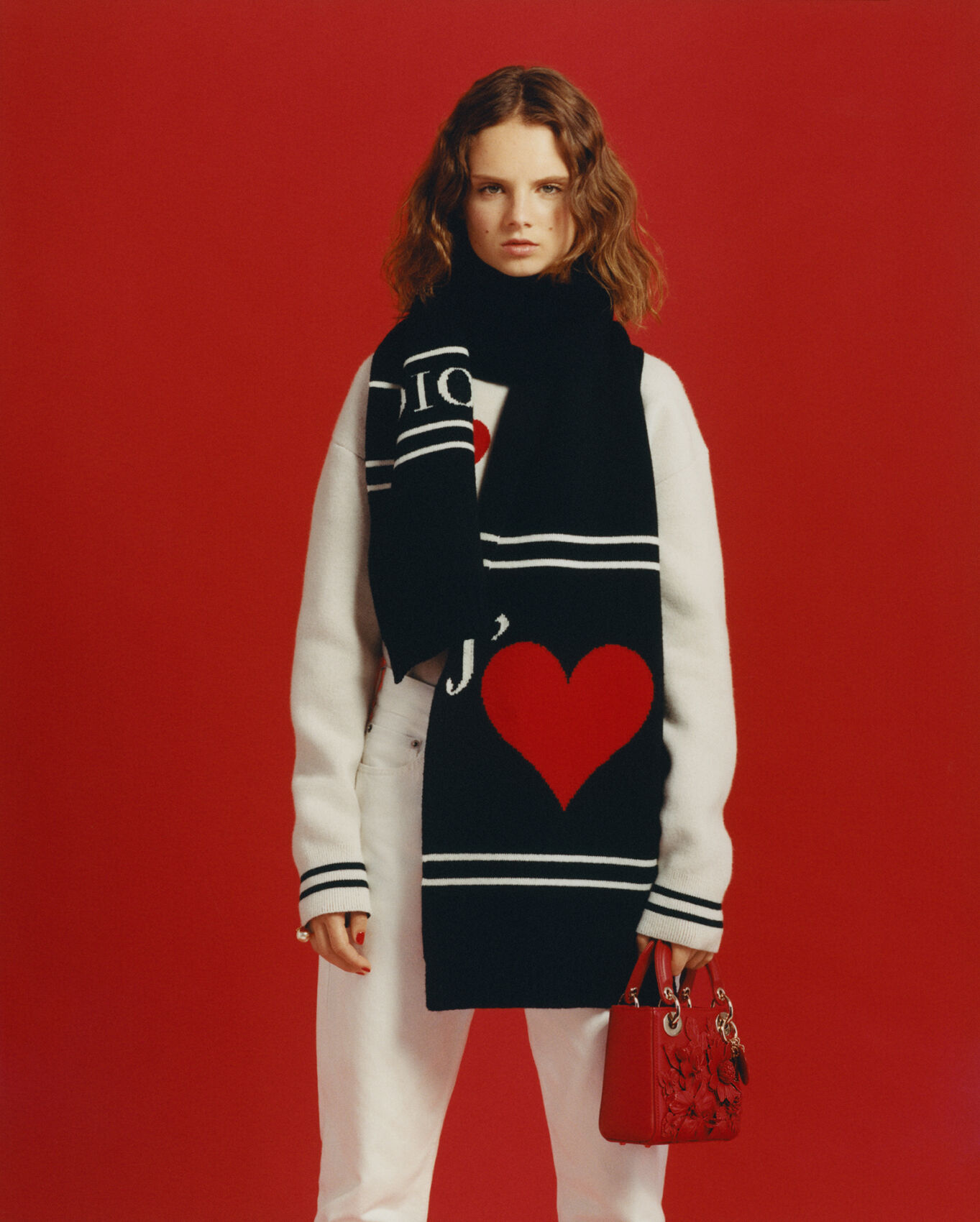 A woman stands against a deep red background, wearing a white outfit accented with a large black scarf featuring stripes and a bold red heart. Her curly hair frames her face, and she holds a textured red handbag. The overall style is chic and modern, with a striking contrast between the red and black elements.