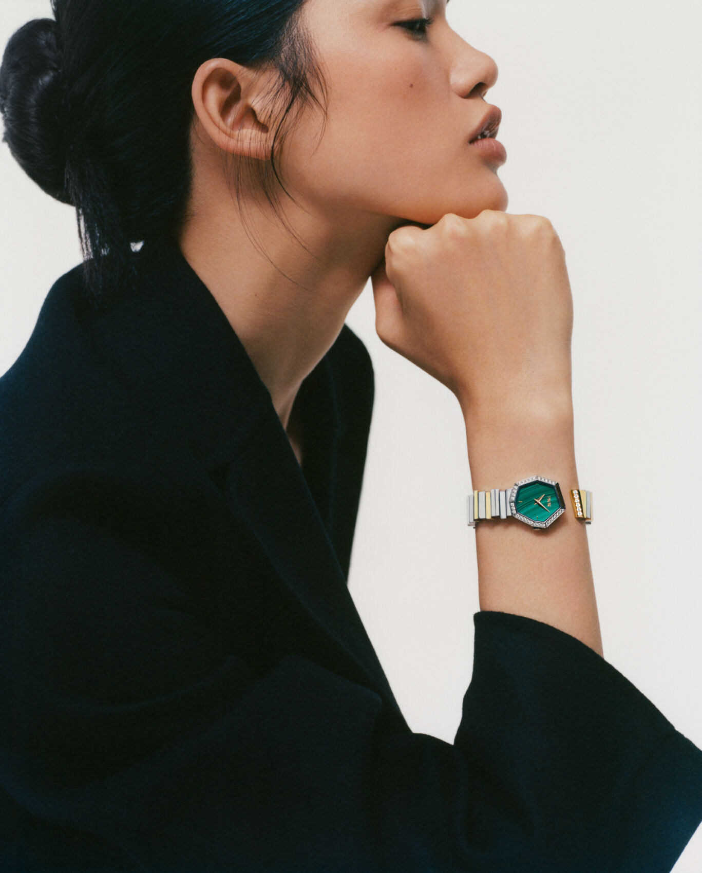 A person with dark hair is posed in profile, resting their chin on their hand. They wear a sophisticated dark jacket and a wristwatch with a gold and silver-toned bracelet and a green-hued face. The background is light, emphasizing the person's thoughtful expression and the elegance of their attire and accessories. The overall composition is minimalist and stylish.