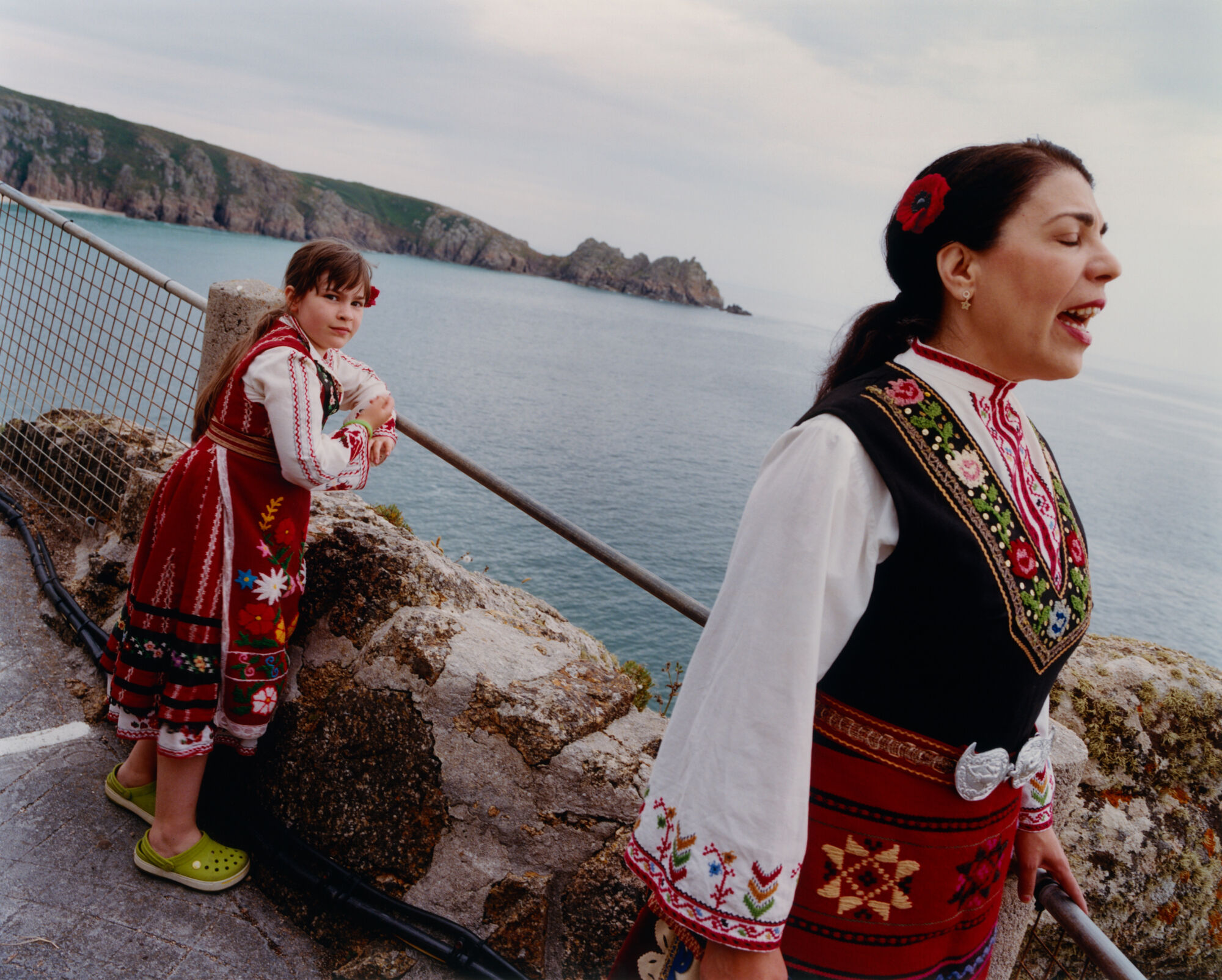 Two individuals stand near a seaside, dressed in vibrant, traditional attire with intricate embroidery. The background features a vast, calm ocean with distant cliffs under a cloudy sky. One person appears to be singing or speaking passionately, while the other looks relaxed, leaning on a stone wall. Their clothing includes vivid patterns and a rich color palette.