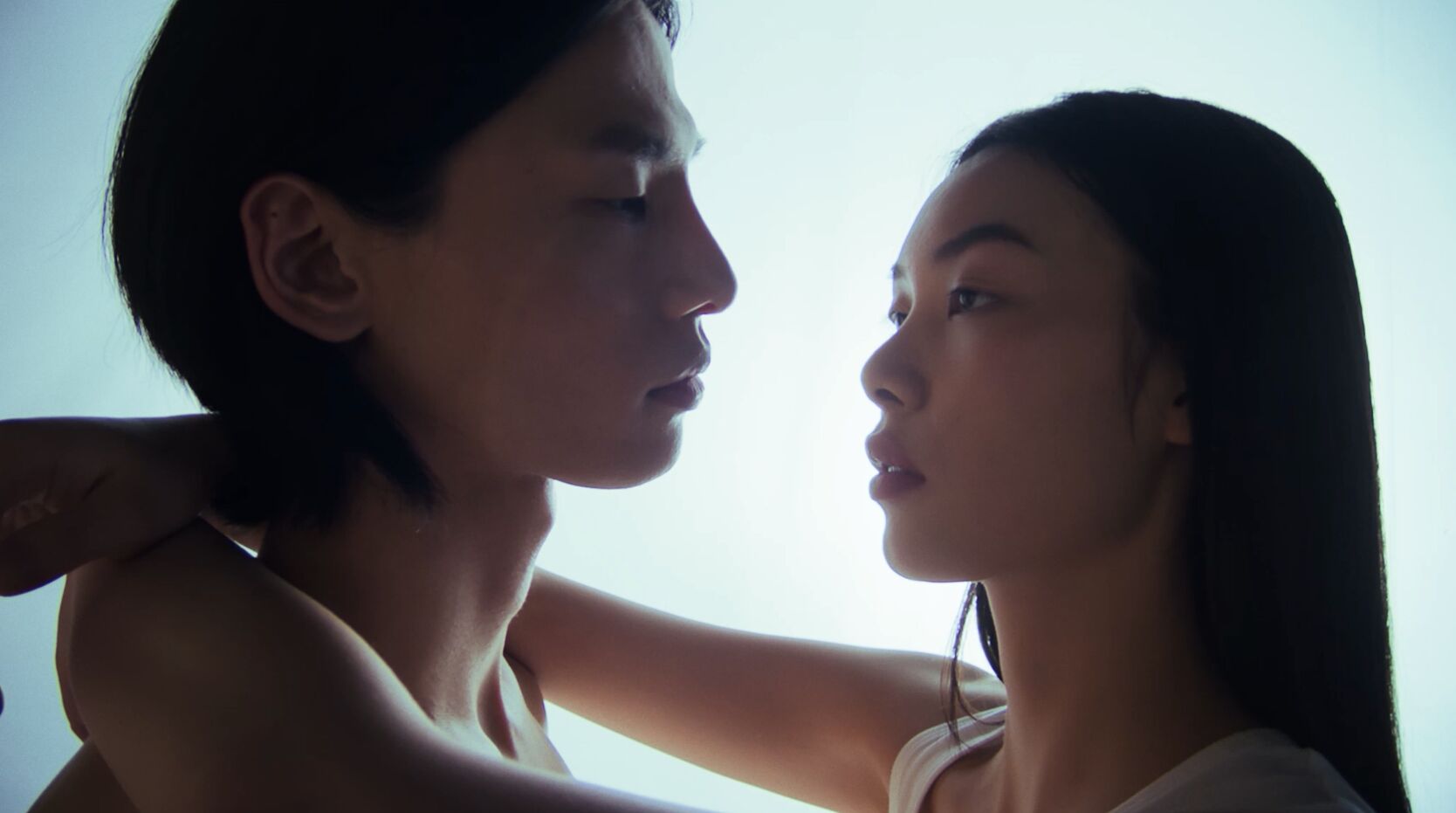 The red tone and soft outline create a mood of passion, energy, and mystery, a visual metaphor for emotion or desire. A close-up, intimate shot of two people kissing. The lighting is bright and soft, contrasting the earlier red scene, and the styling, a red ruffled top and natural textures, gives the image a tactile, emotional feel.