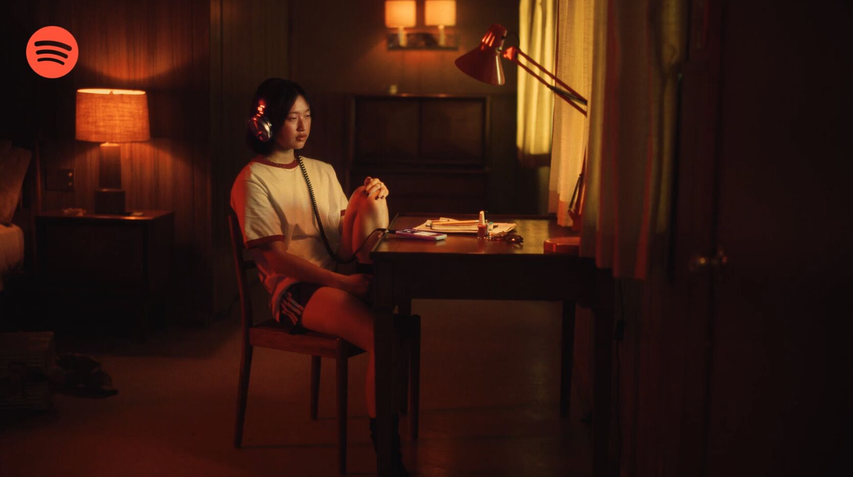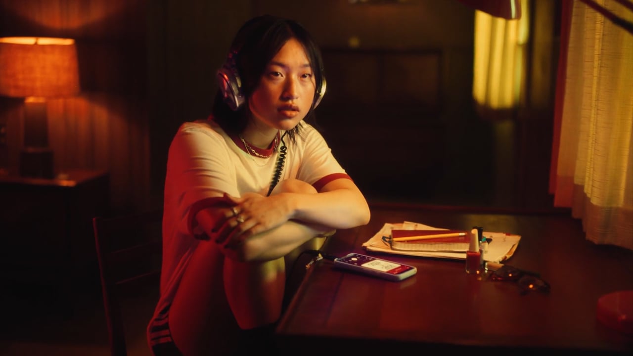 A young person sits at a wooden table in warm, dim light, wearing large silver headphones and a white T-shirt with red trim. One knee is pulled close to the chest, arms wrapped around it. A phone, notebook, pencil, lighter, and sunglasses rest nearby. The mood feels quiet, introspective, and late-night contemplative, suspended between sound and stillness.
