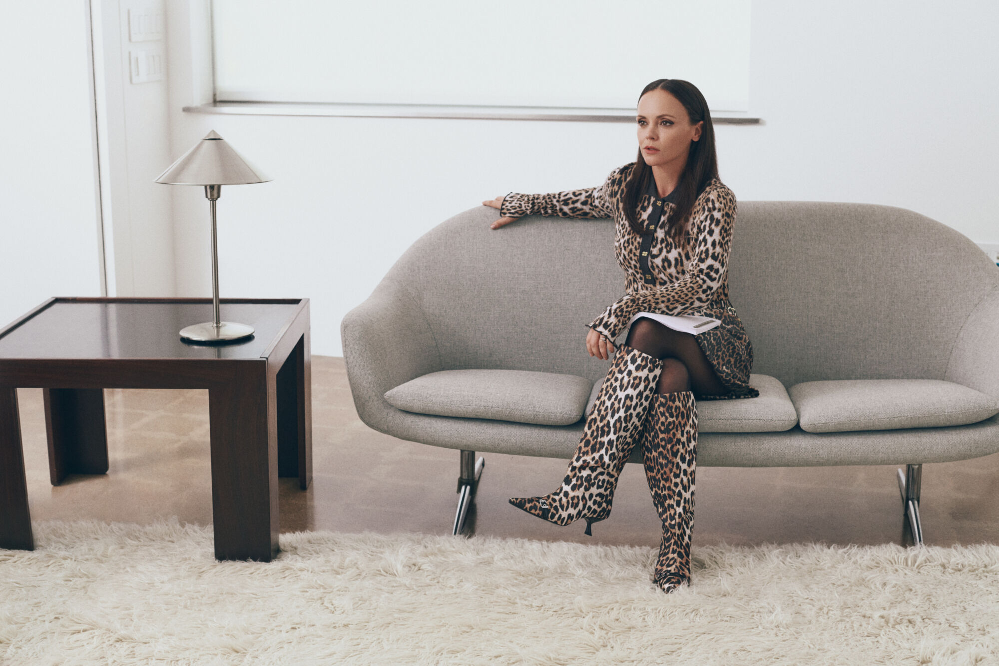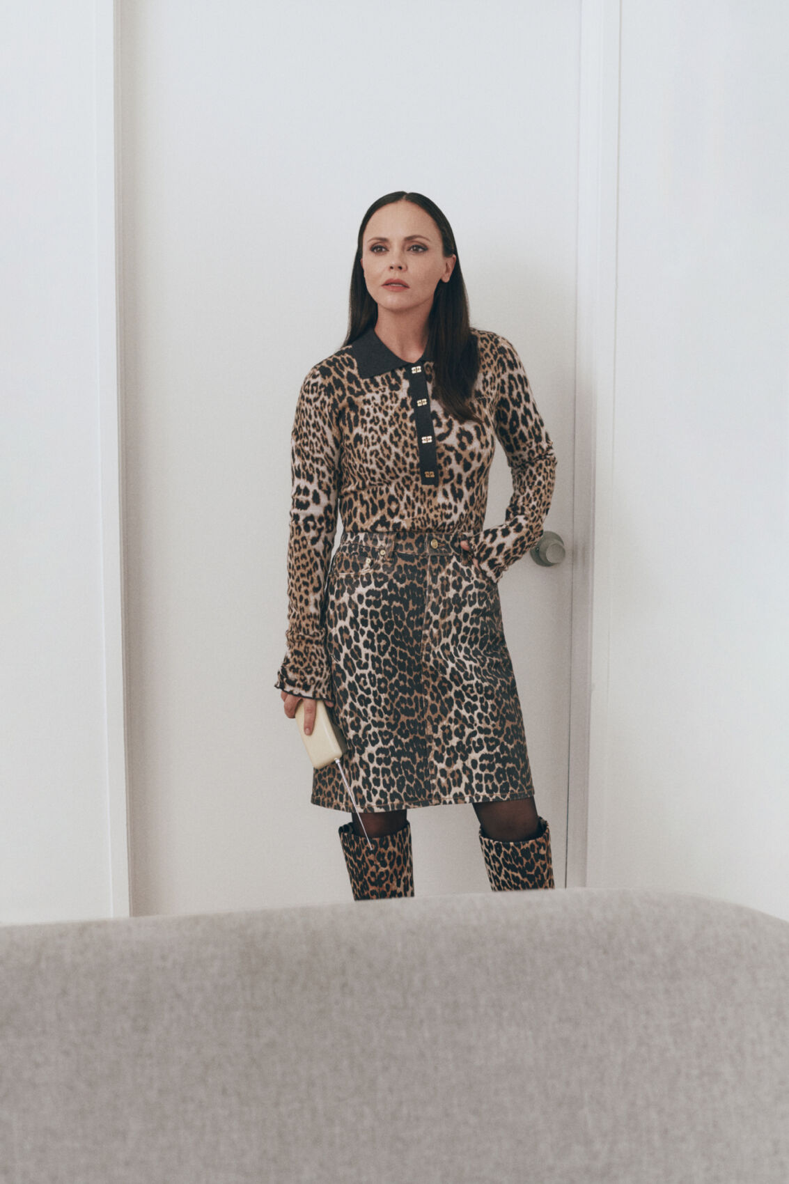 A woman stands confidently near a white wall and door, wearing a leopard print dress and matching knee-high boots. Her long, dark hair is worn straight, and she carries a small beige clutch. Her expression is poised and self-assured. In the foreground, the edge of a gray sofa can be seen, adding depth to the setting.