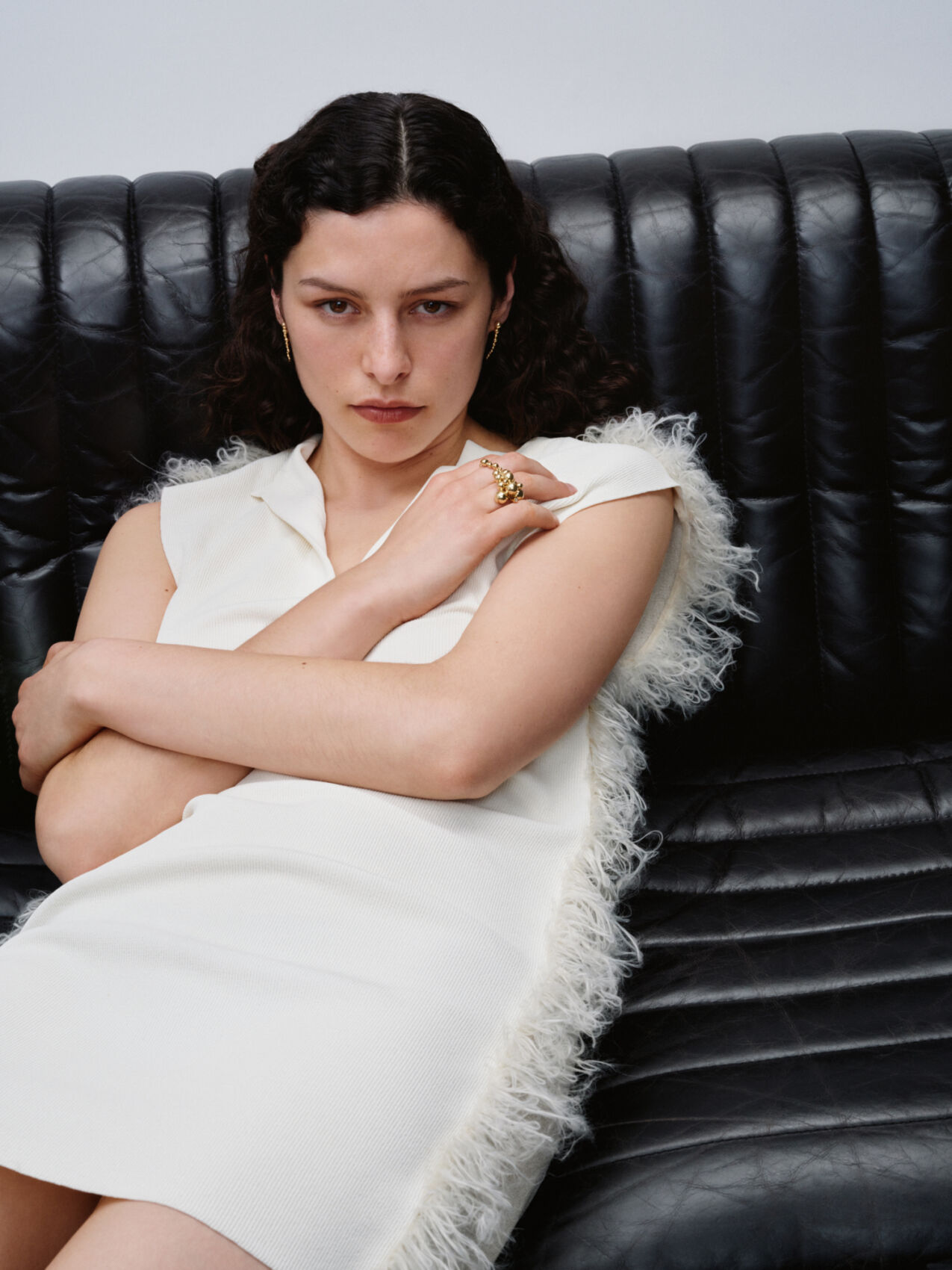 A woman with curly hair sits on a black leather sofa. She is wearing a sleeveless white dress with textured edges and has a thoughtful expression, her arms folded across her front. She accessorizes with gold hoop earrings and rings. The setting suggests a minimalist, modern aesthetic, with emphasis on texture and contrast between her attire and the furnishings.