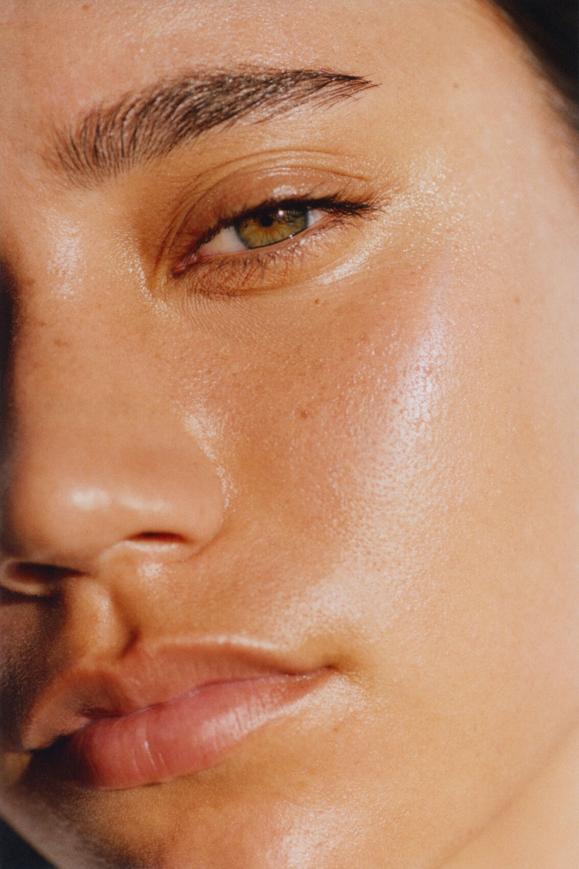 A close-up of a person's face highlights smooth, radiant skin with a natural glow. The focus is on one eye with lush lashes, shaped eyebrow, and soft, full lips. The complexion displays a healthy shine, with subtle freckles and fine skin details visible, creating a sense of freshness and vitality. The lighting accentuates facial features beautifully.