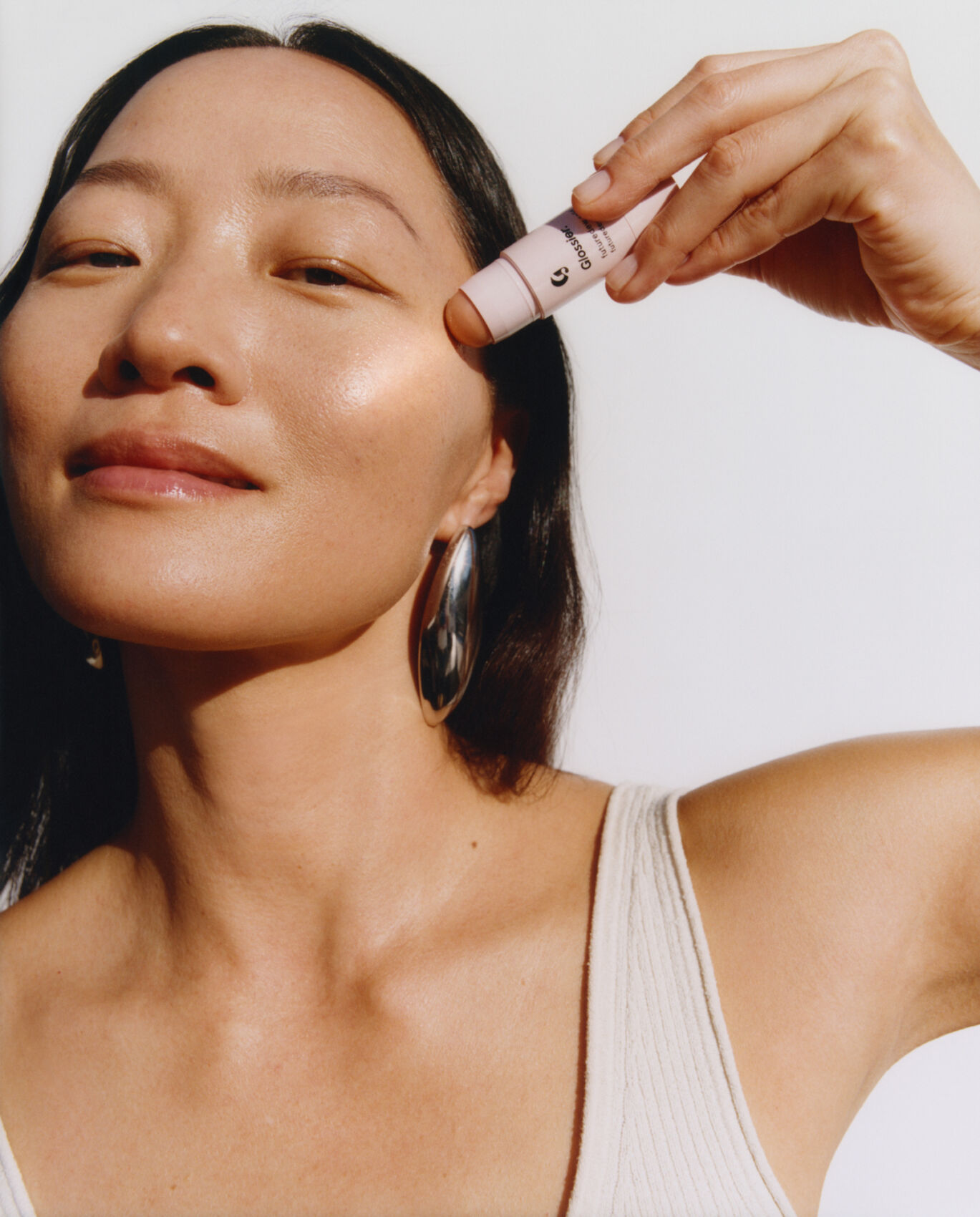 A person with long dark hair is applying a makeup stick to their cheek. They have a soft smile and are wearing a sleeveless, ribbed top. Their skin appears luminous, highlighting the dewy makeup application. A large, metallic earring adorns one ear, contributing to a stylish and modern look. The background is bright, adding to the fresh aesthetic.