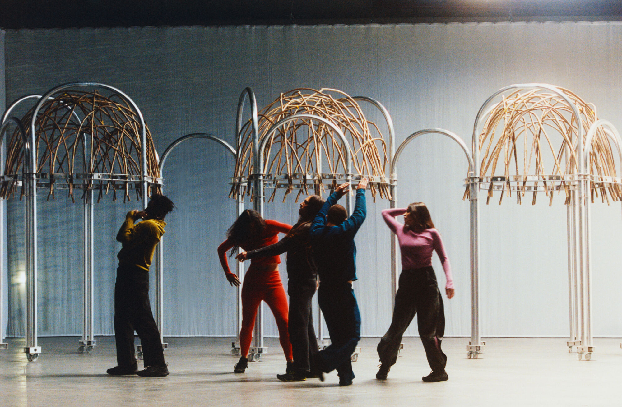 Five people engage in expressive movement beneath intricate metallic arches with woven branch structures. The individuals wear colorful, contrasting outfits in a spacious setting, marked by a soft, diffused light. The scene has an artistic, performance-like quality, capturing a blend of motion, creativity, and interaction against a minimalist, modern backdrop, highlighting a dynamic fusion of human expression and architectural elements.